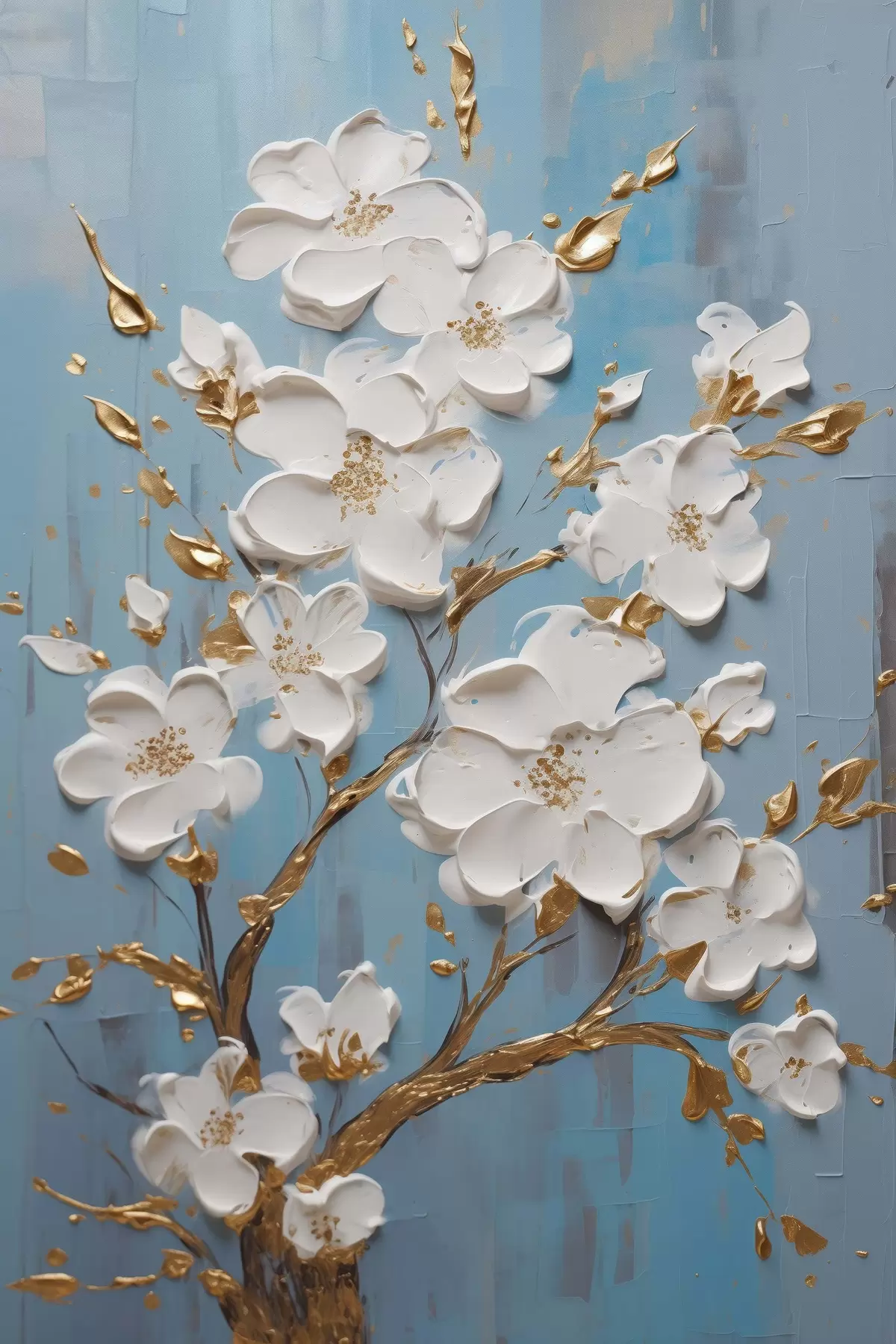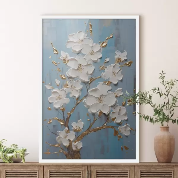 Plakat Valged lilled oksal: helesinistes toonides dekoratiivne motiiv f45541