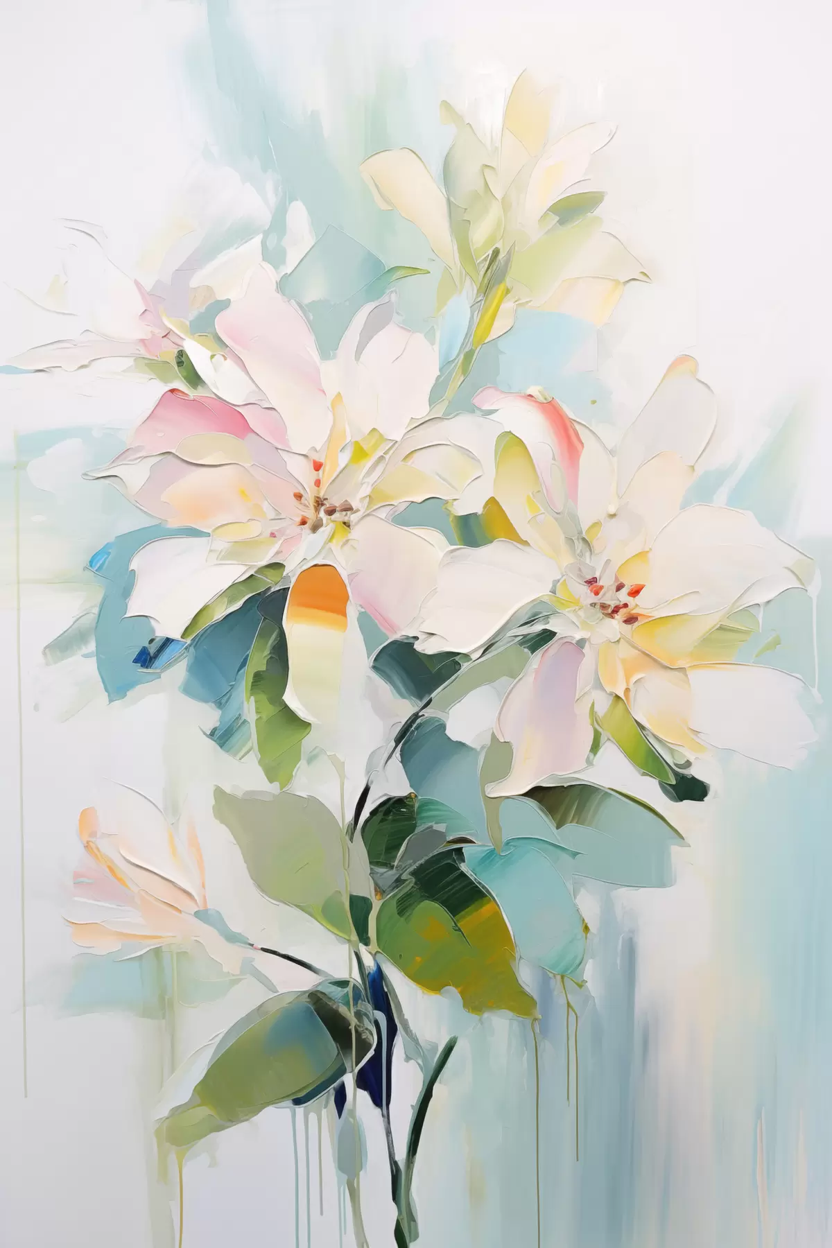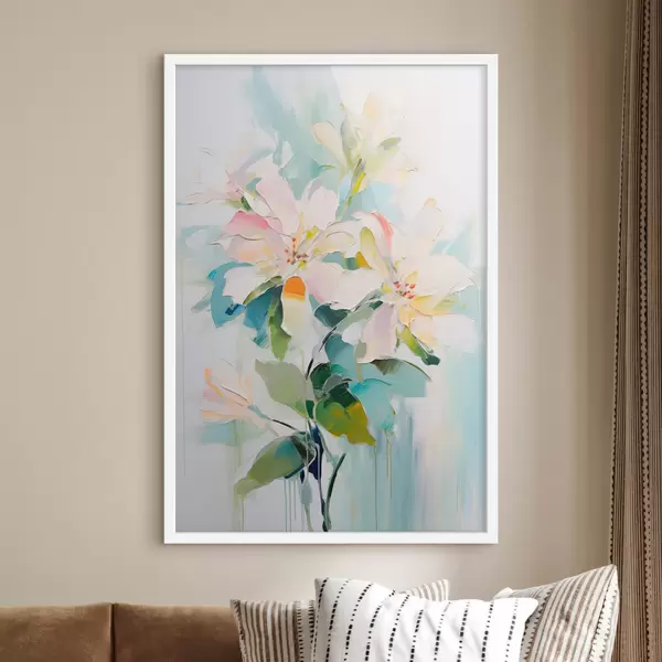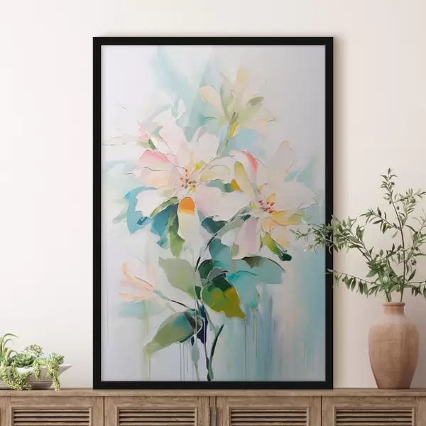 Poster Värviliste aktsentidega lilled, rohelised lehed, pehmed pintslitõmbed õlimaalide jäljendused, helesinine taust Nr f45549