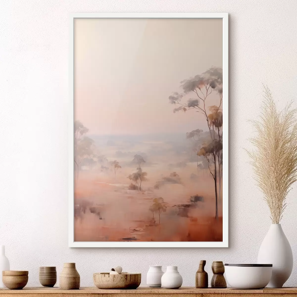 Plakat Maastik, kus põõsad ja puud on roosa , oranži ja pruuni pastelsetes toonides, taustaks mäed f45554