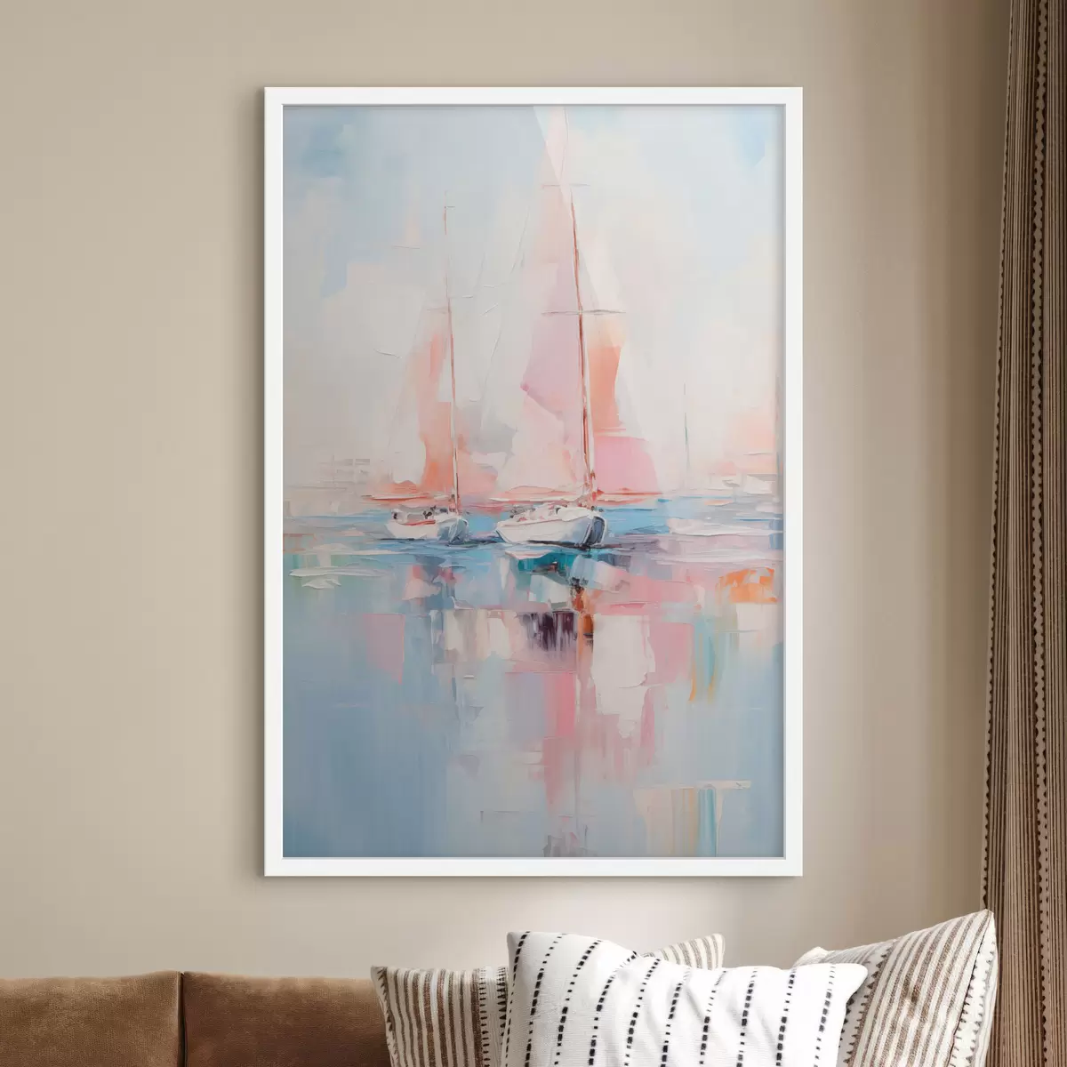 Poster Roosade purjedega purjekad ujuvad rahulikul merel, paatide peegeldused vees, pehmed pastelsed värvid Nr f45557