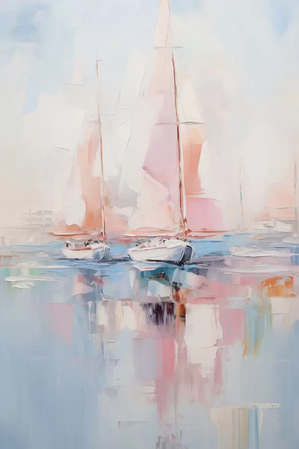 Poster Roosade purjedega purjekad ujuvad rahulikul merel, paatide peegeldused vees, pehmed pastelsed värvid Nr f45557