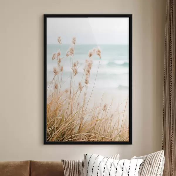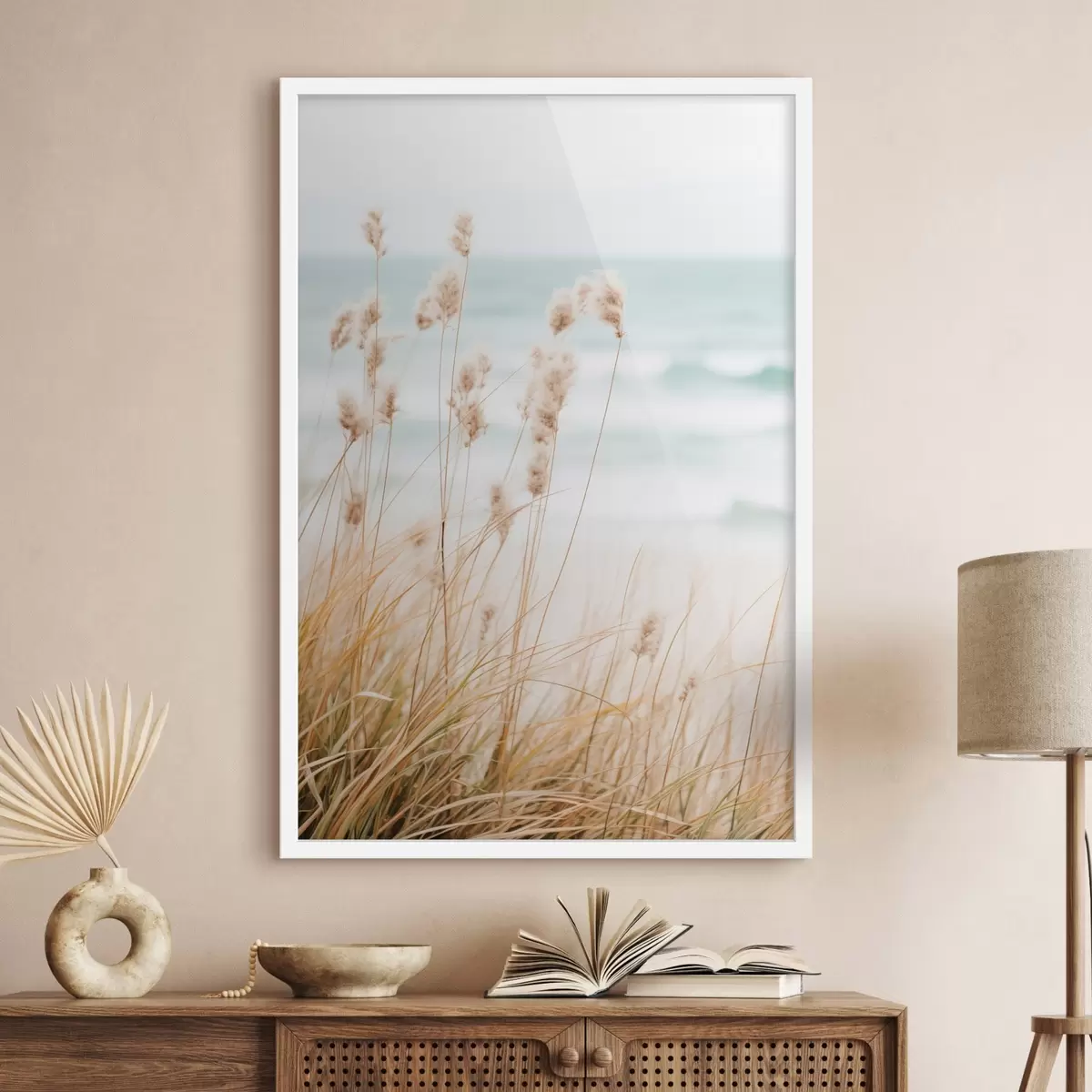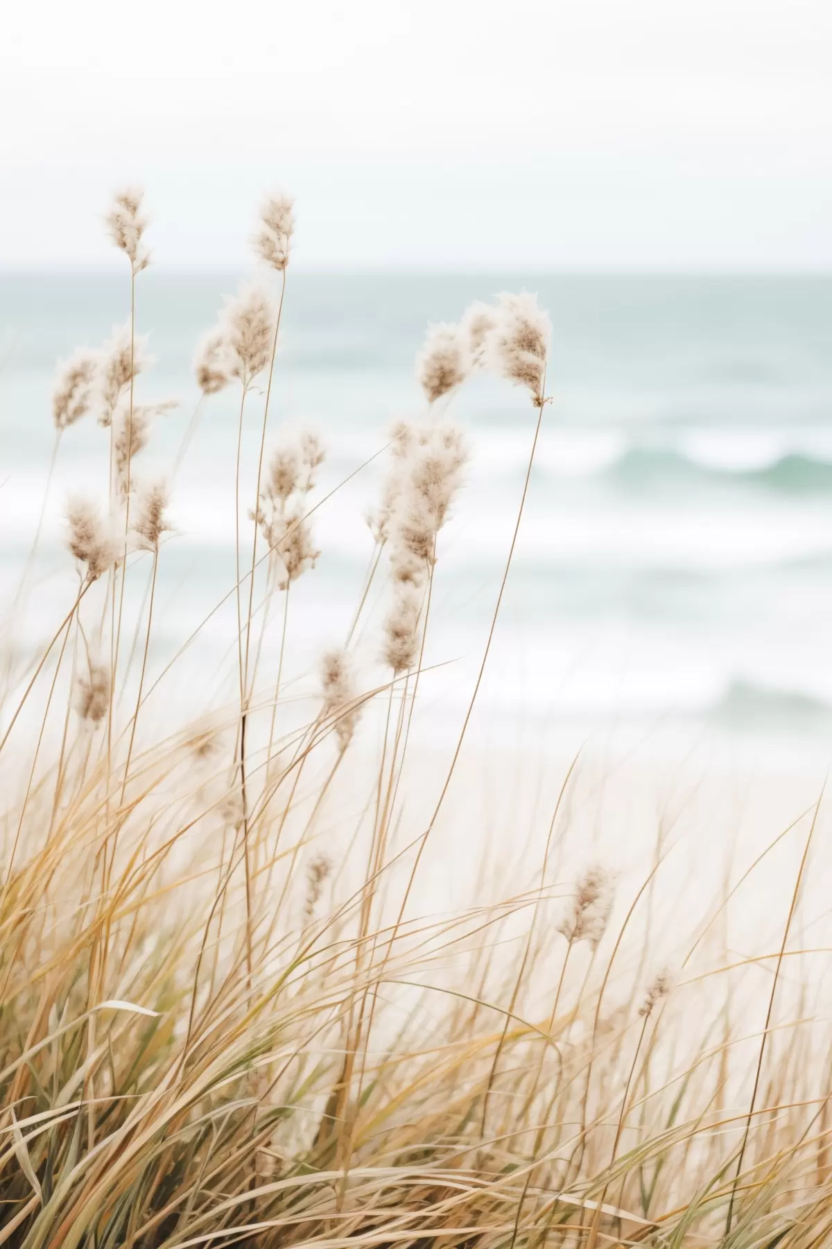 Plakat Kõrge rohi koos kohevate seemnepeadega, liivarand ja ookeanilained taustal, pehme ja vaoshoitud värvipalett f45561