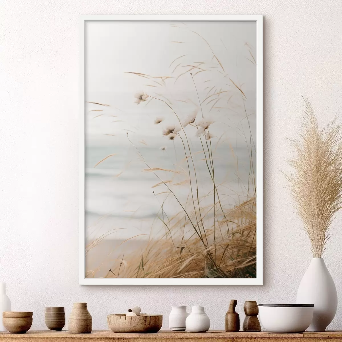 Plakat Natuke puuvillast rohtu ja muud kuiva rohtu ähmase mere ees, pehme ja vaoshoitud värvipalett f45562