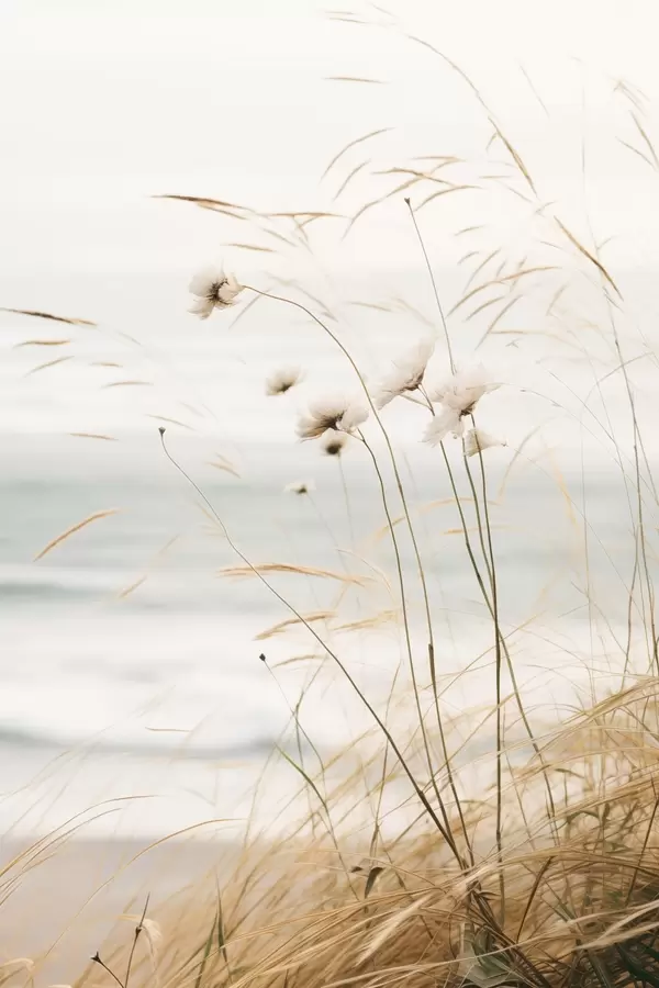 Plakat Natuke puuvillast rohtu ja muud kuiva rohtu ähmase mere ees, pehme ja vaoshoitud värvipalett f45562