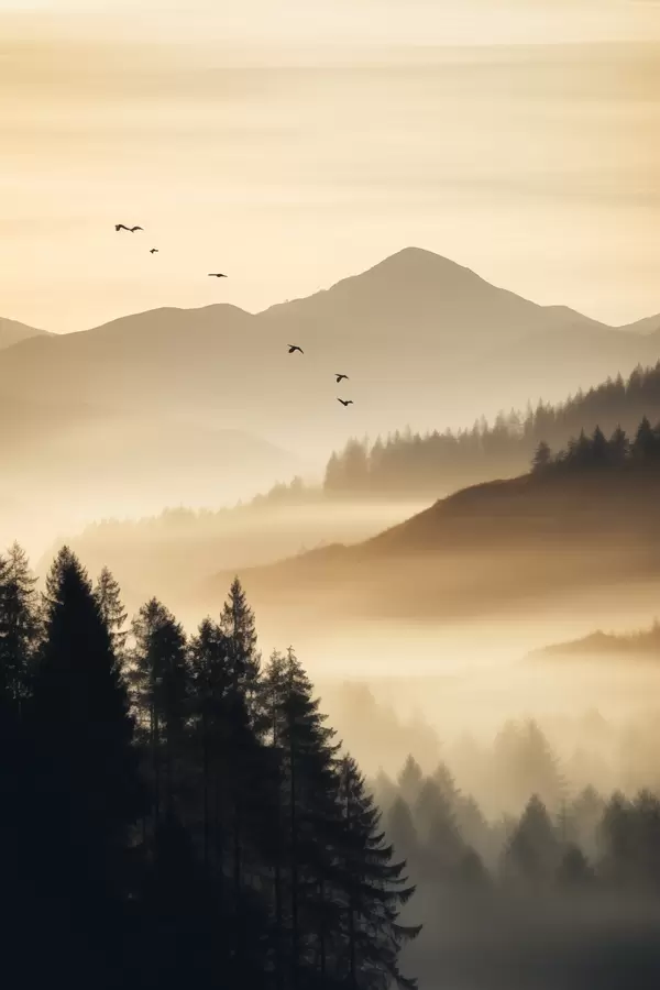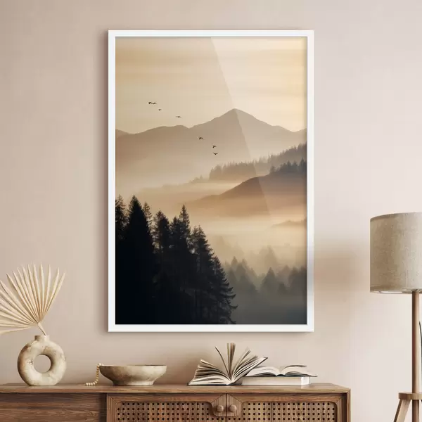 Poster Mägimaastik koos metsa ja taevas lendavate lindudega , kõik kaetud paksu udukihiga päikesetõusu ajal Nr f45563