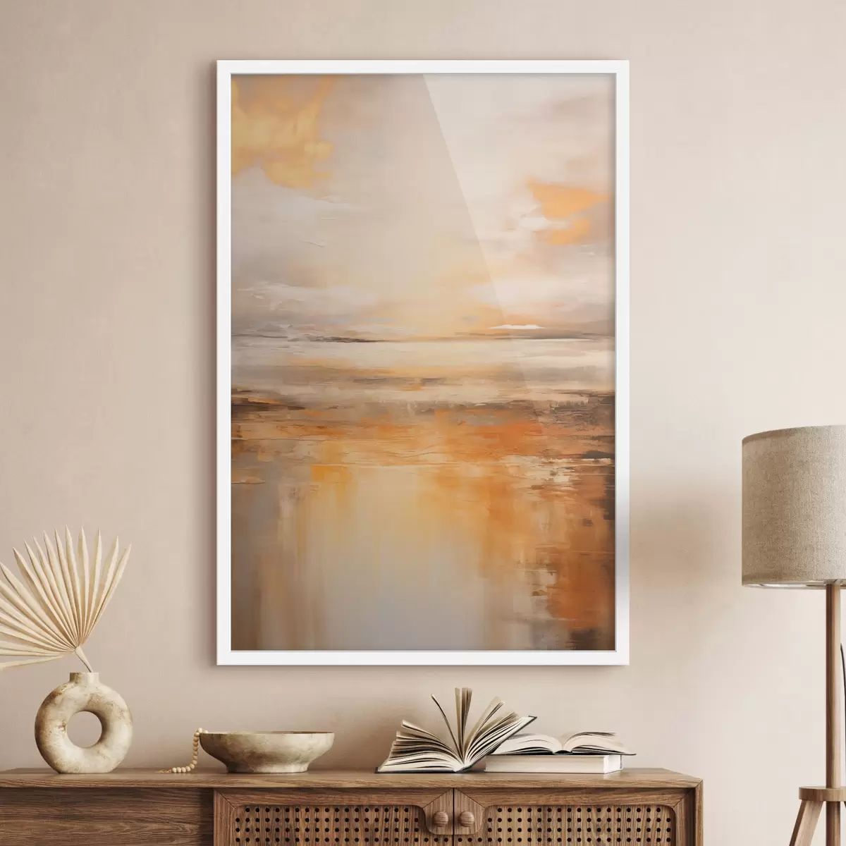 Plakat Abstraktne maal rannamaastikust, kus on rahulik ookean, oranž liiv ja pilvine taevas koos päikesega f45567