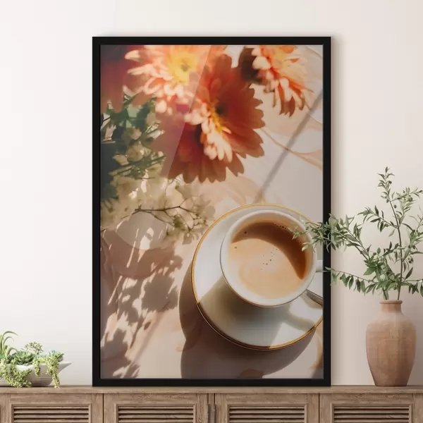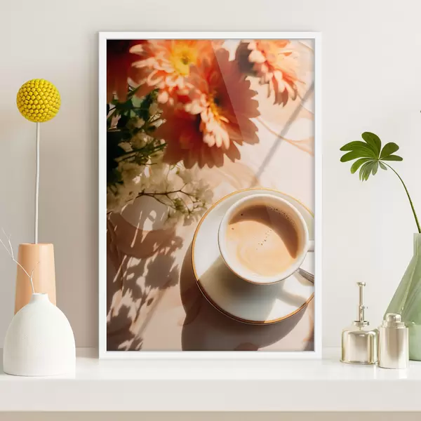 Plakat Tass kohvi koos vahuga valgel taldrikul, taustal mõned lilled, päikesevalguses f45570