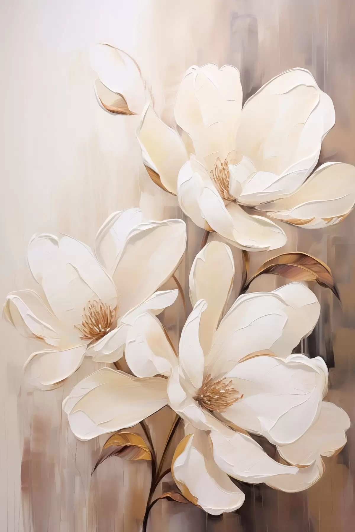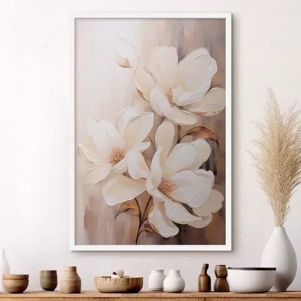 Plakat Valged magnoolia lilled pehmel, hägustatud beeži ja pruunide toonidega taustal, elegantne lillekompositsioon f45571