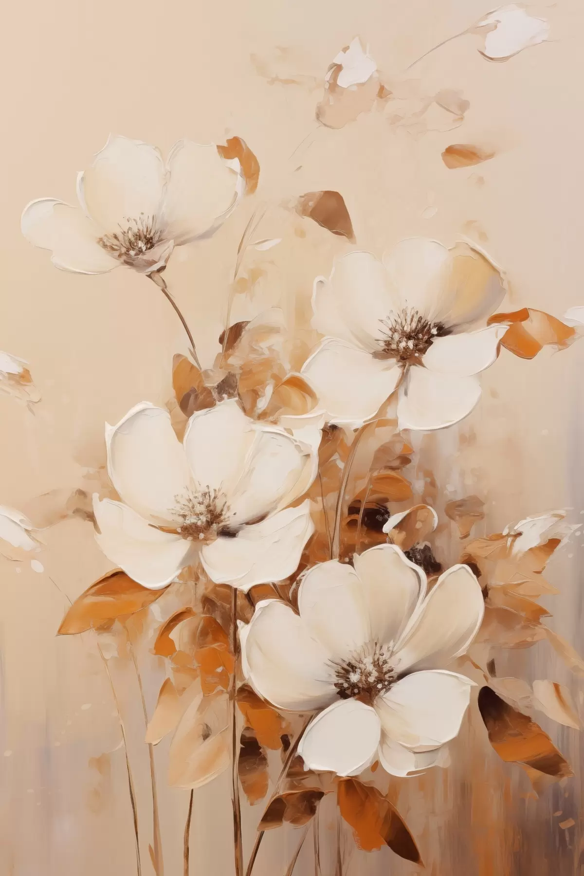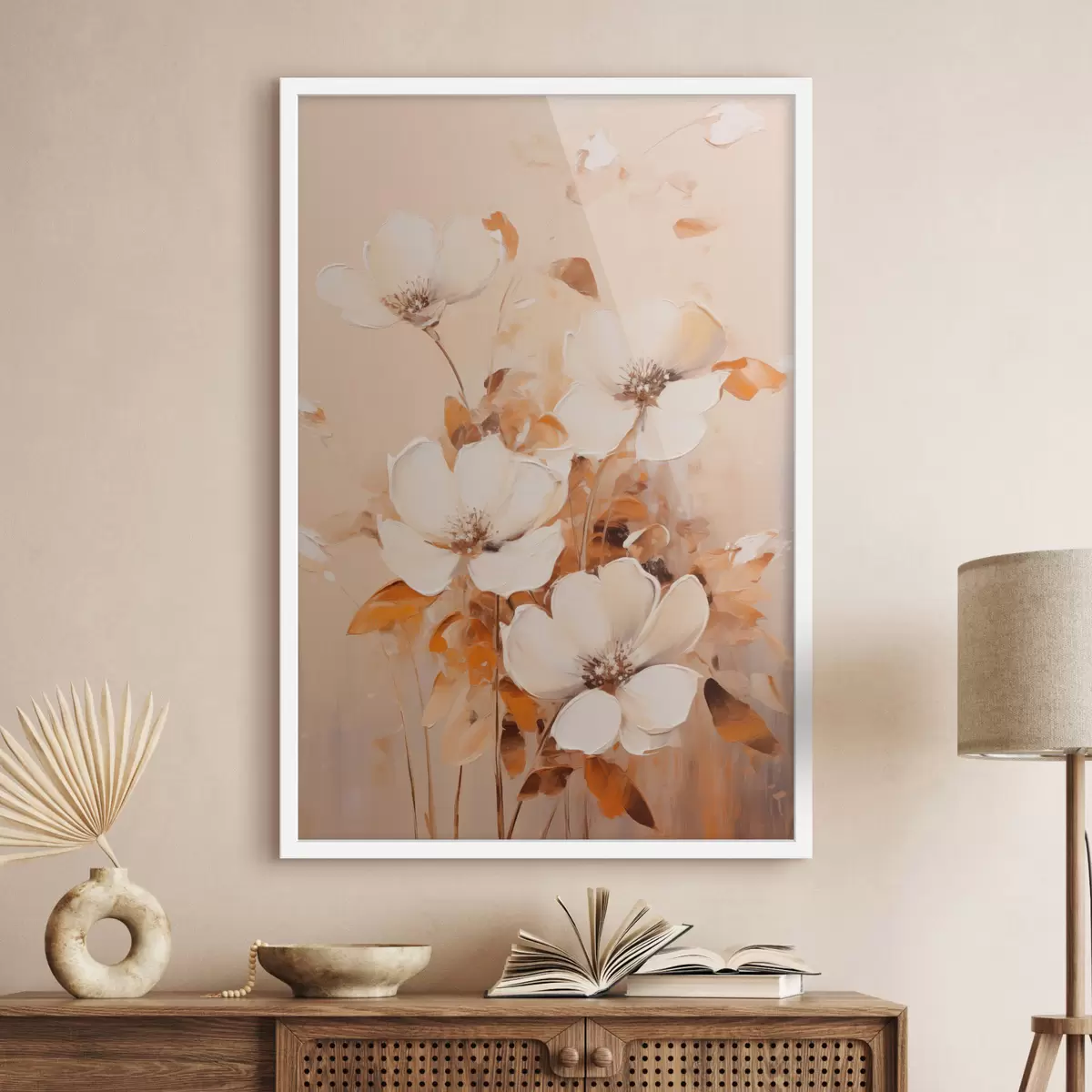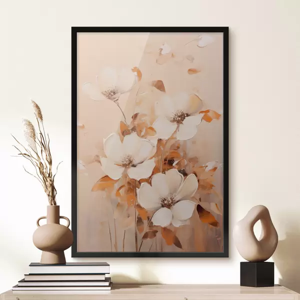 Plakat Valged lilled oranžide lehtedega, õrnad pintslitõmbed, soe värvipalett, elegantne kompositsioon f45573