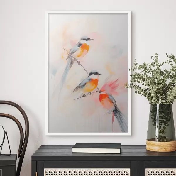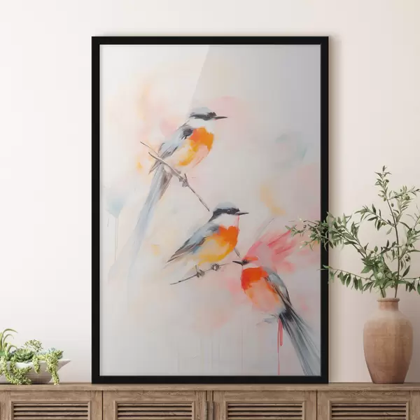 Poster Oksadel istuvad linnud, pehmed pastelsed värvid, heledal taustal roosa ja valge toonid Nr f45577