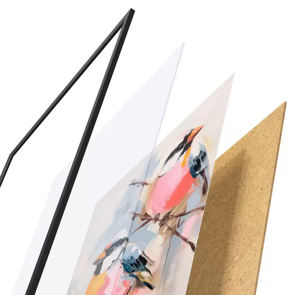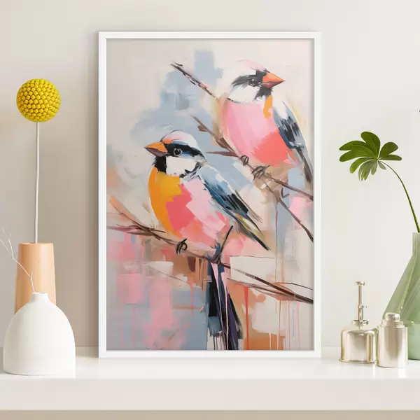 Plakat Värvilised linnud istuvad oksal pehmel pastelsel taustal f45578
