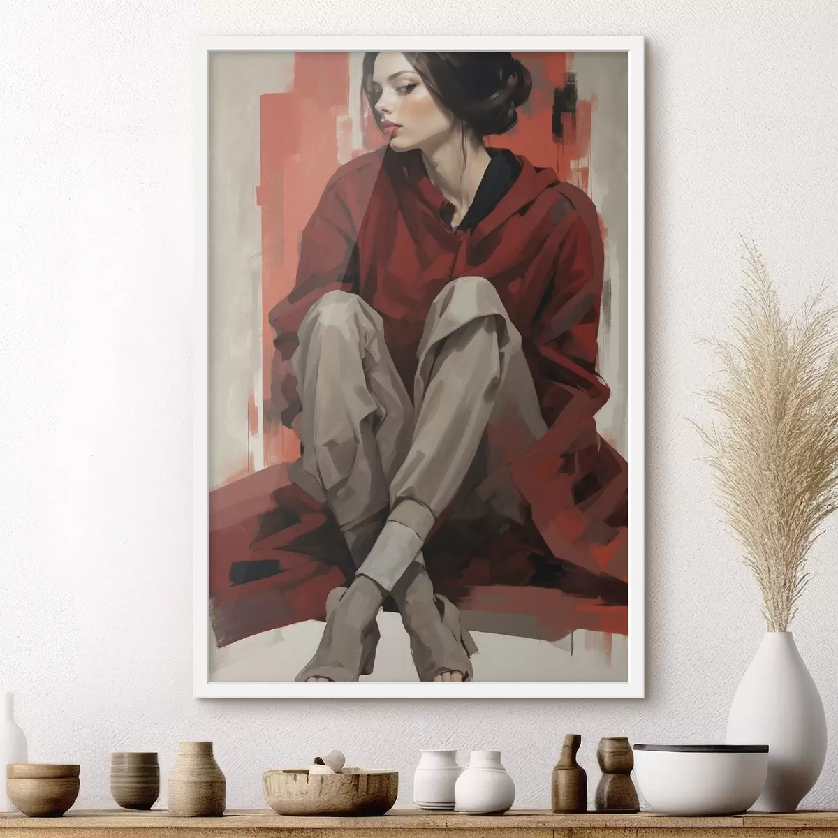 Plakat Tüdruk punases mantlis istub kokku pandud jalgadega f45624