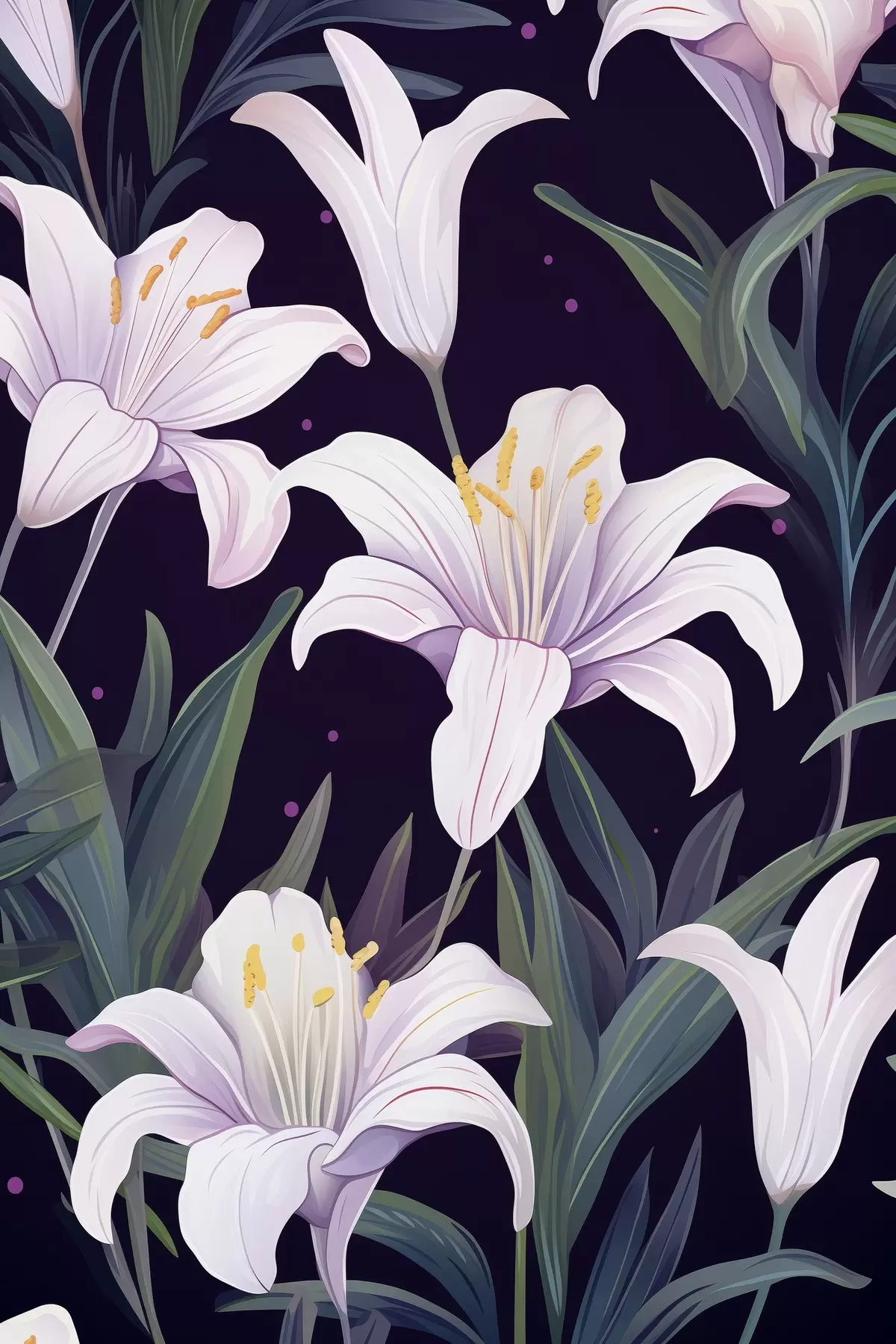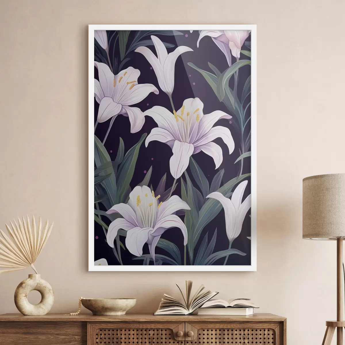 Poster Õrnad liiliad tumedal taustal roheliste lehtedega Nr f45697