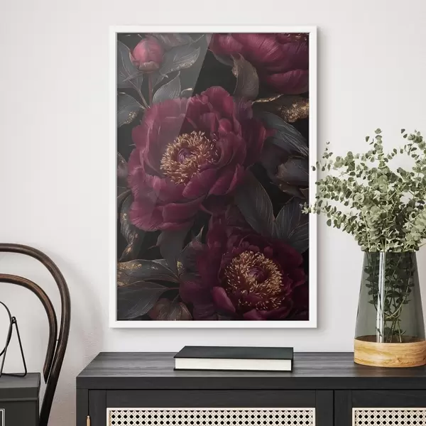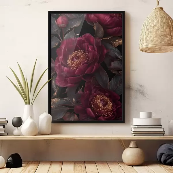 Poster Burgundia peonid mustal taustal kollaste aksentidega Nr f45877