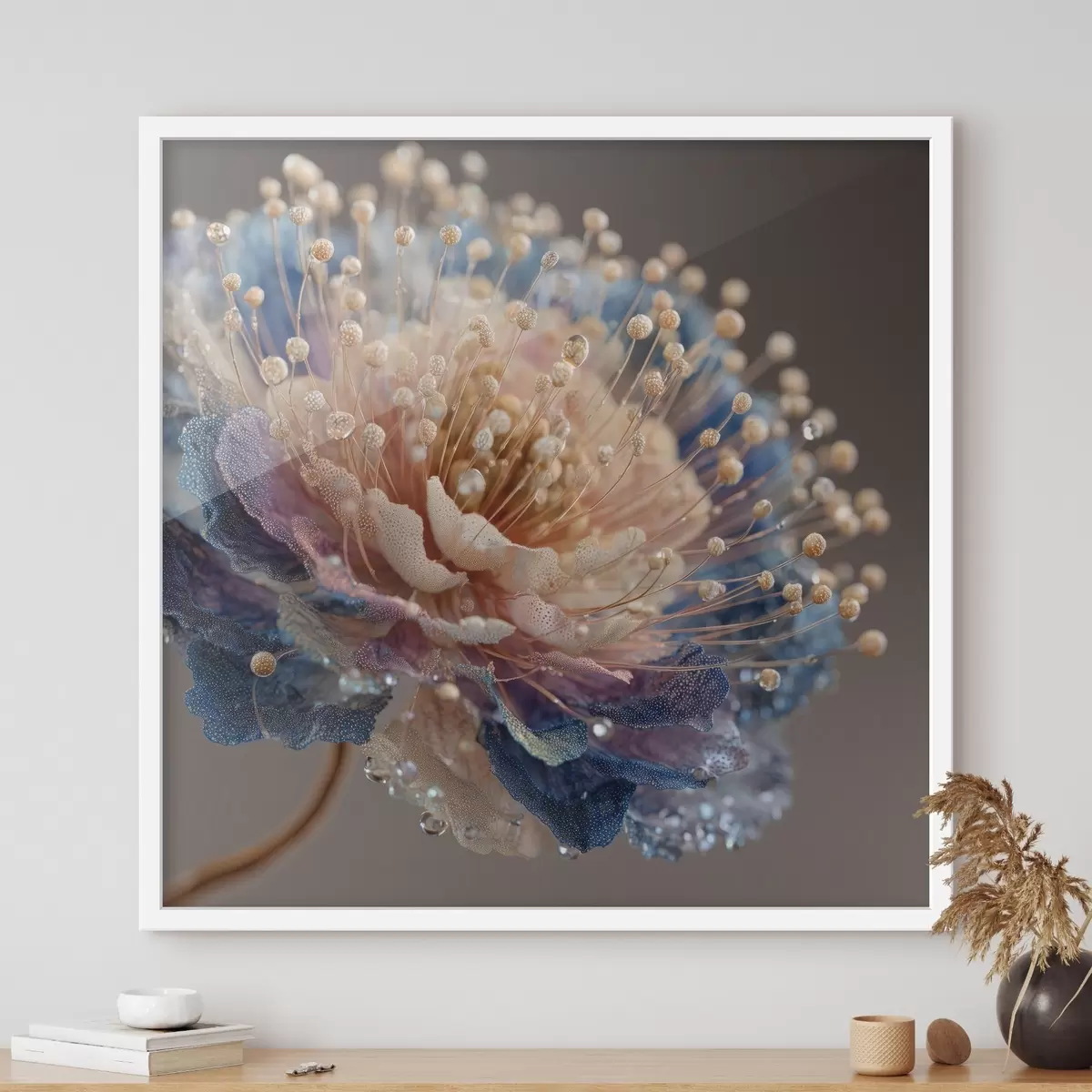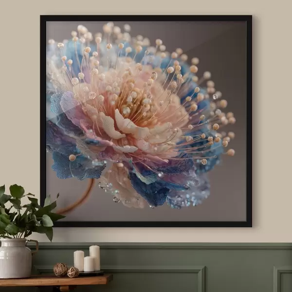 Poster Pärlmutterjas lill kastepiiskadega, virsiku- ja sinised kroonlehed Nr f45911