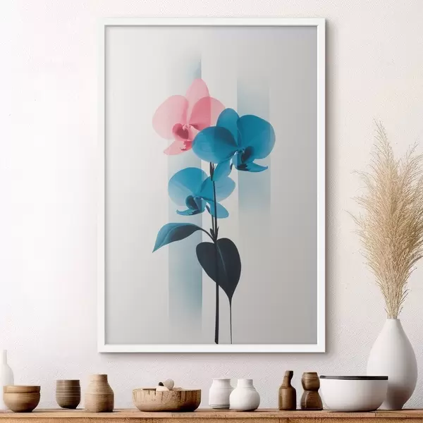 Plakat Orhideed lehtedega valgel taustal vertikaalsete triipudega f45925