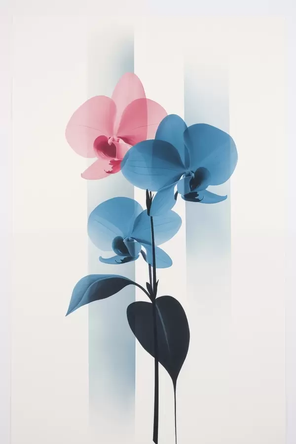 Plakat Orhideed lehtedega valgel taustal vertikaalsete triipudega f45925