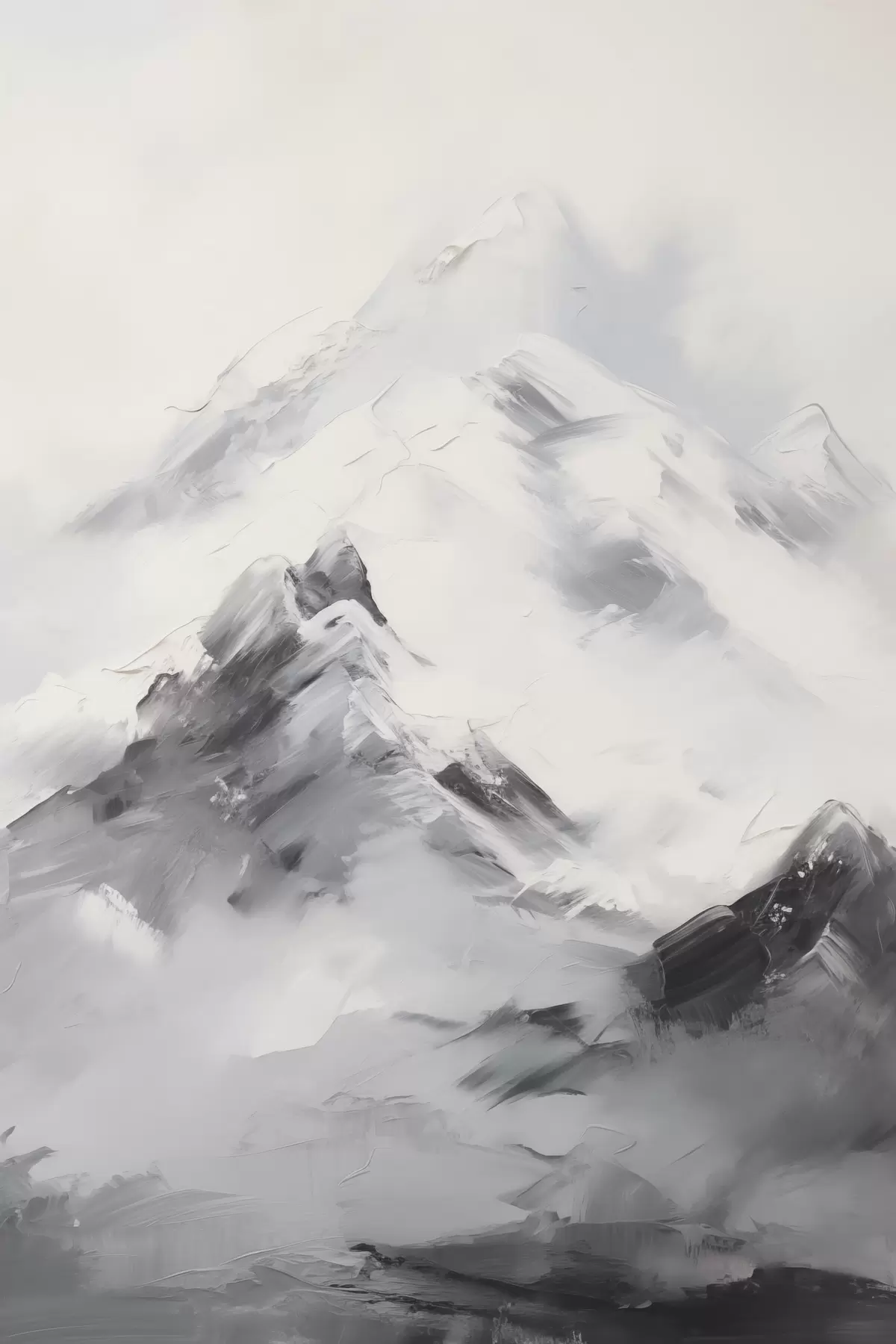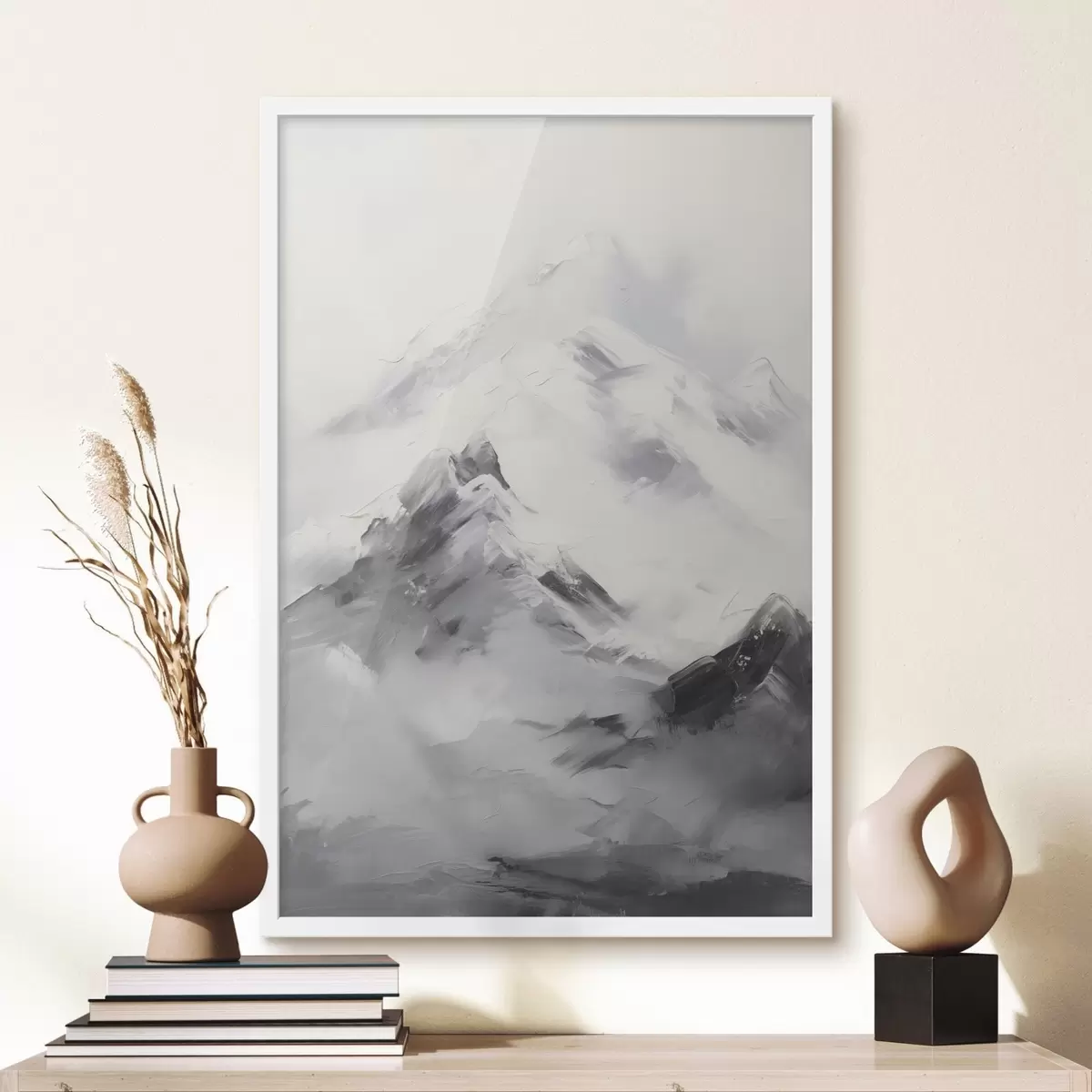 Plakat Lumised mäetipud hallide varjudega, hall taevas, pintslitõmbed, tekstuurne, minimalistlik f45933