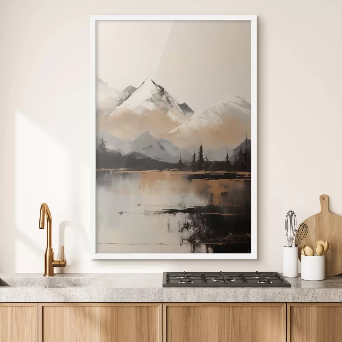 Poster Lumised tekstuuriga mäed mõne puuga järve ees Nr f45951