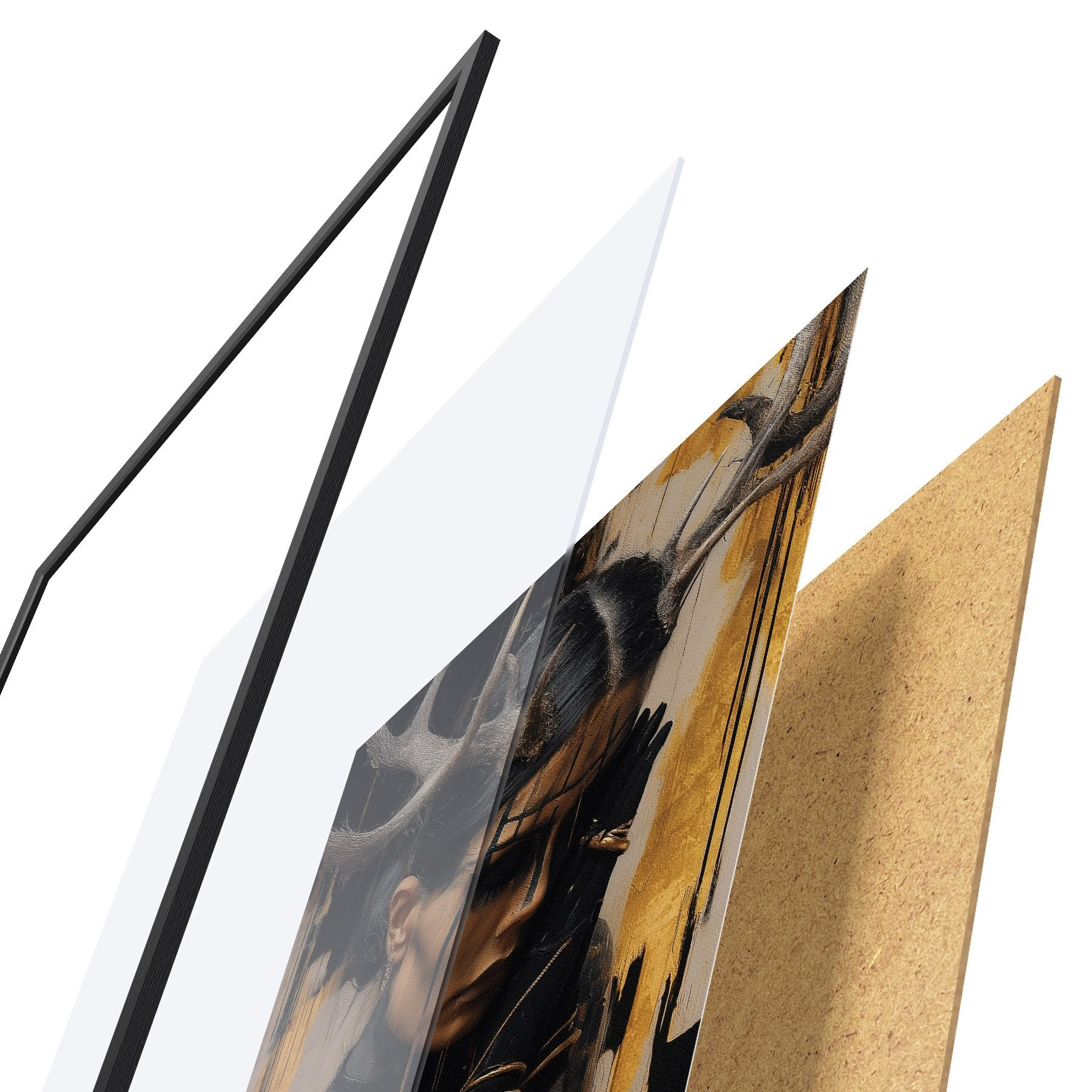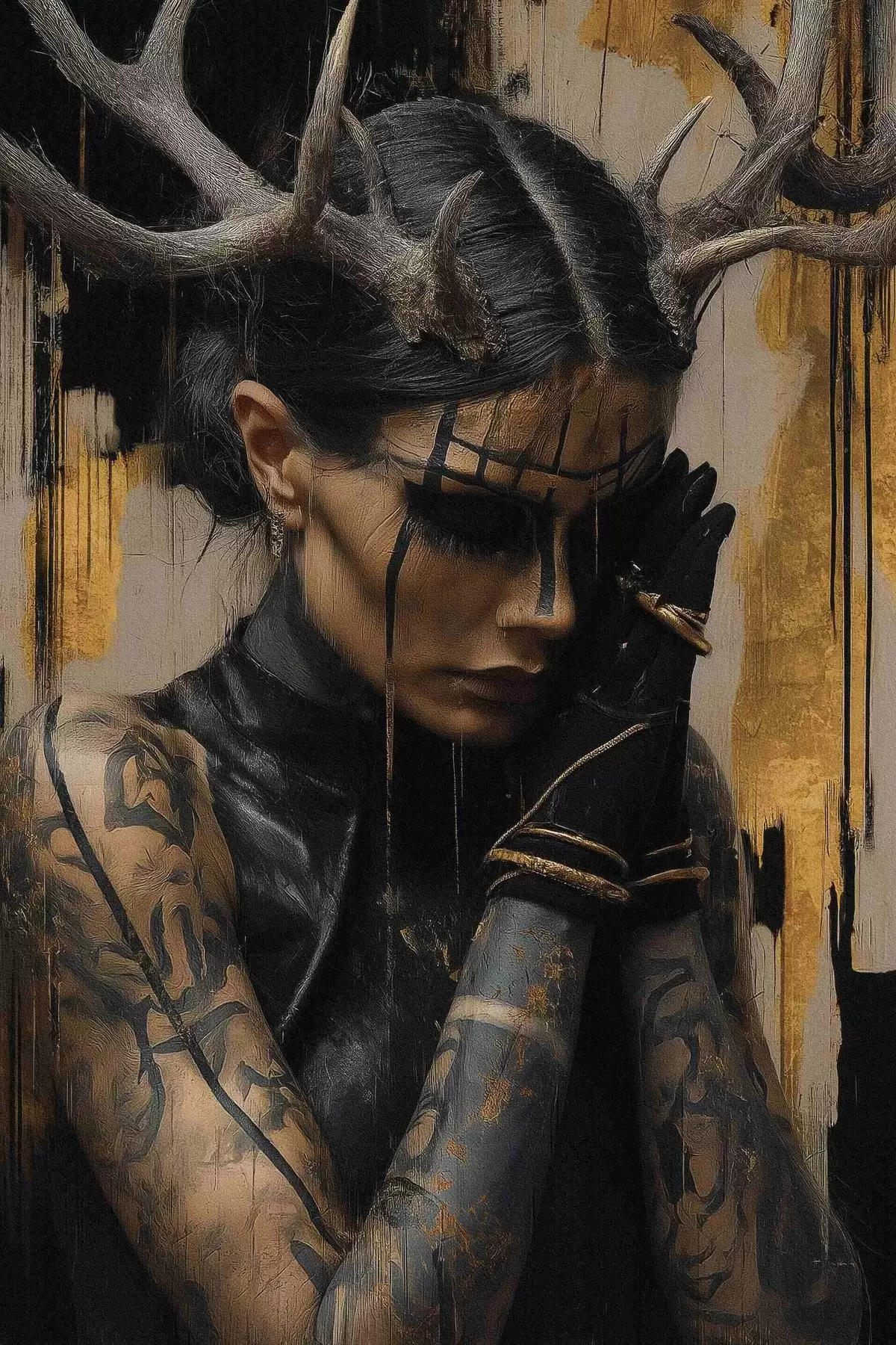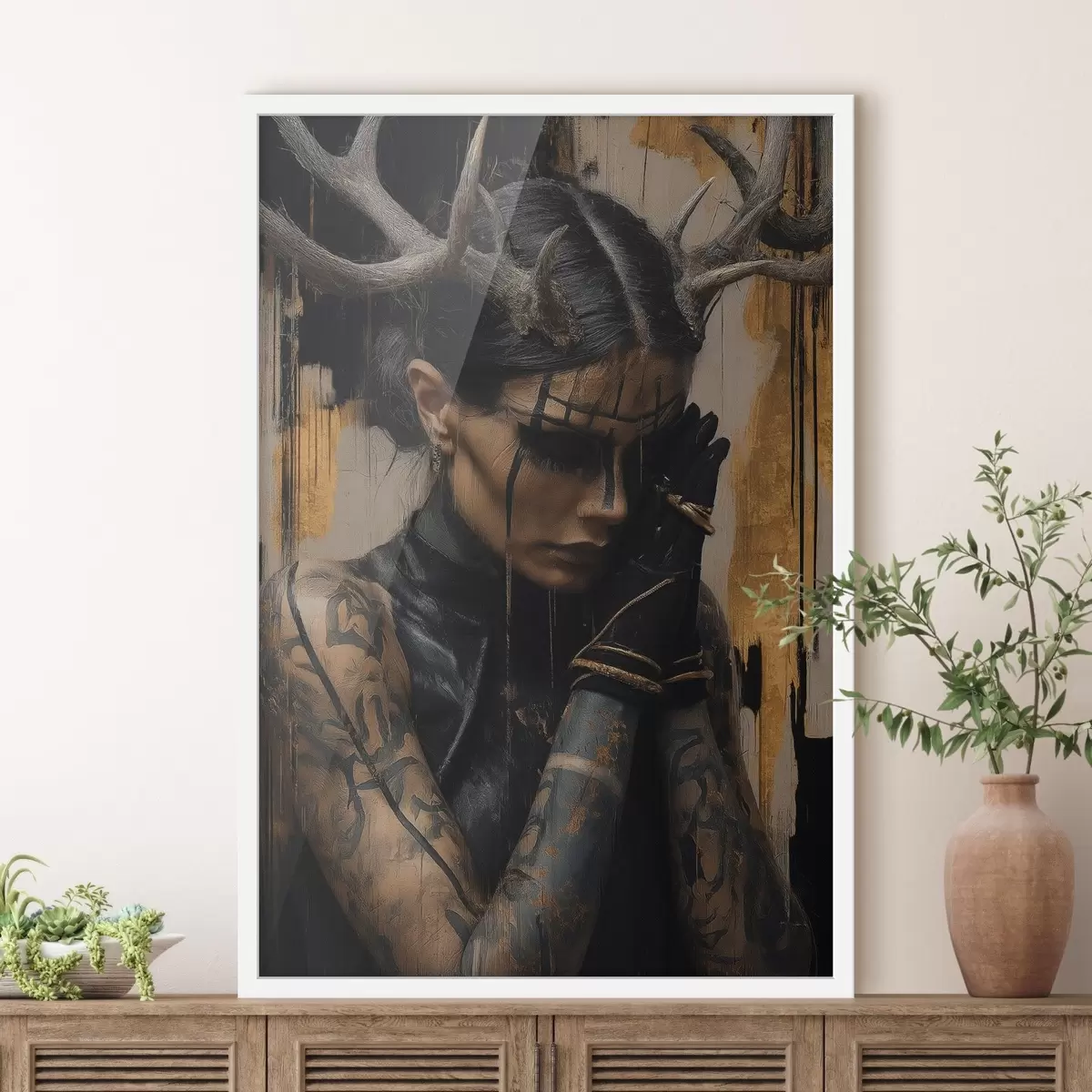 Plakat Naine sarvedega tumedas välimuses ja mustade näojoontega f46144