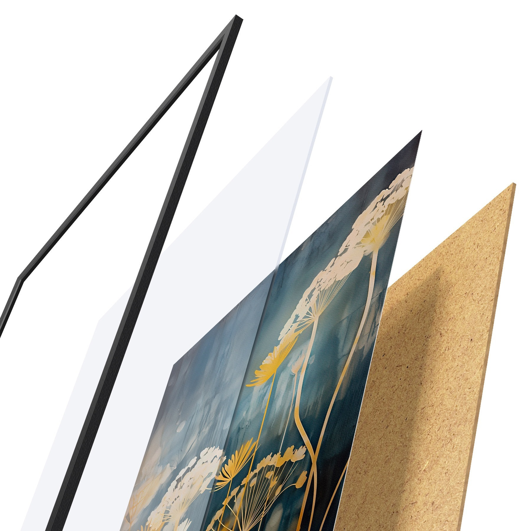 Plakat Stiilse kujundusega õied õhukeste vartega tumedal taustal f46188