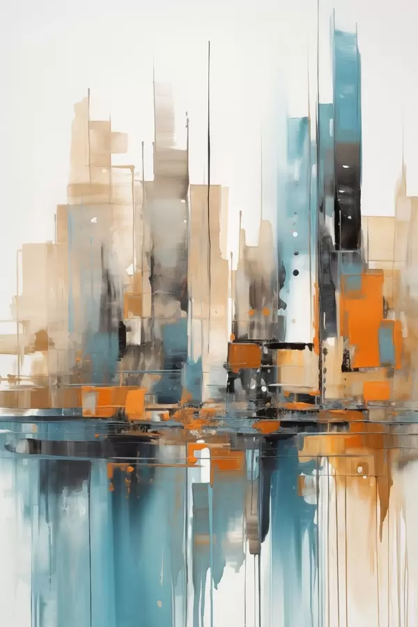 Poster Abstraktne linnamaastik oranži, sinakasrohelise ja pruuni värvi vertikaalsete pintslitõmmetega ja geomeetriliste kujunditega Nr f46266