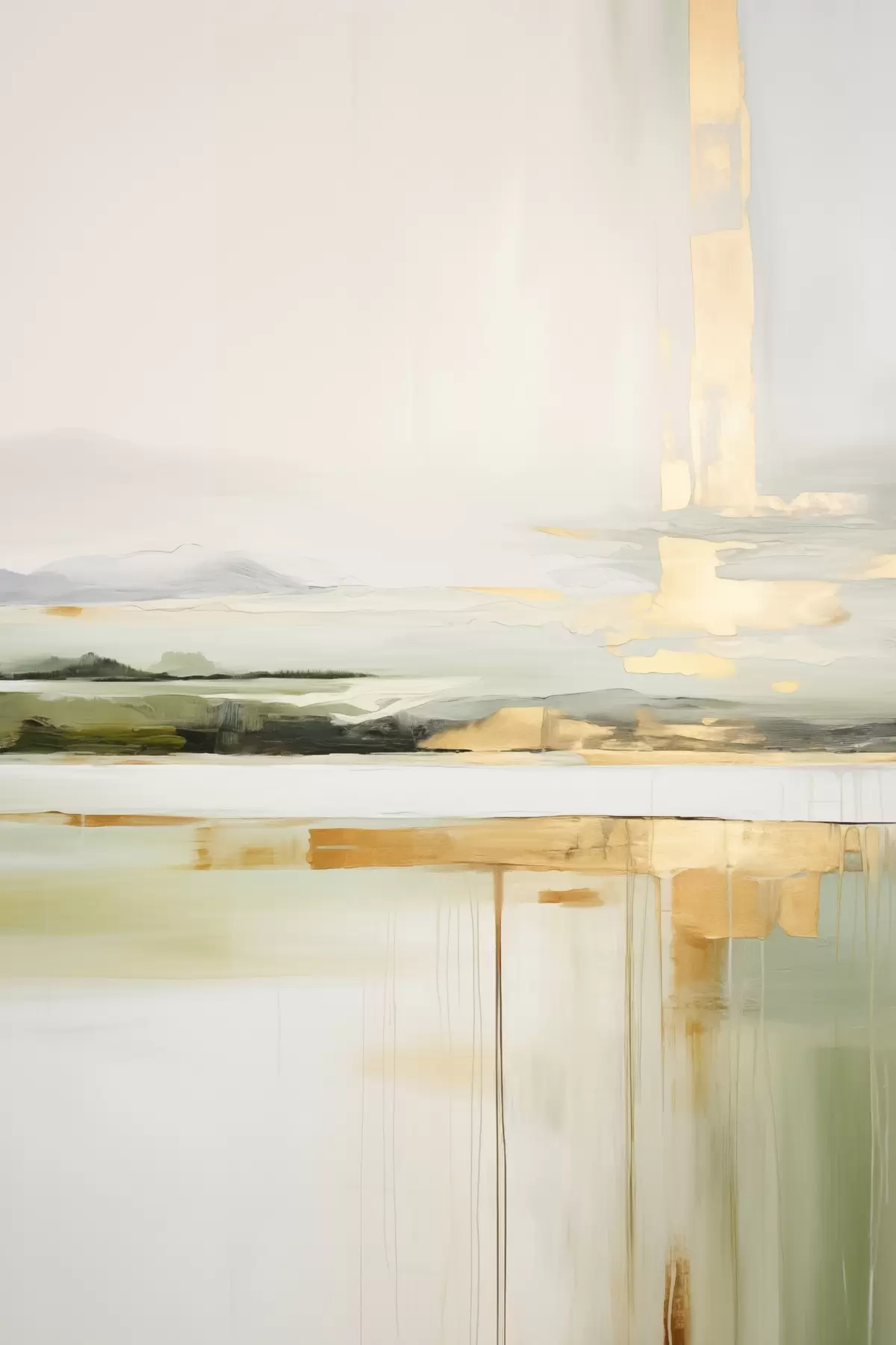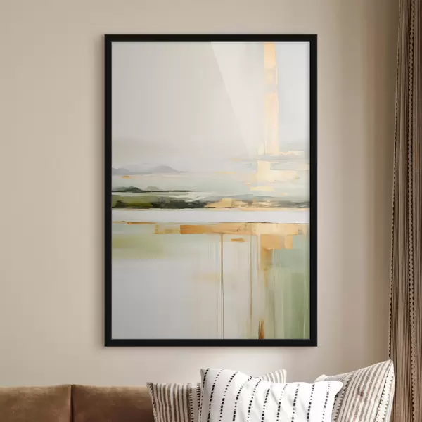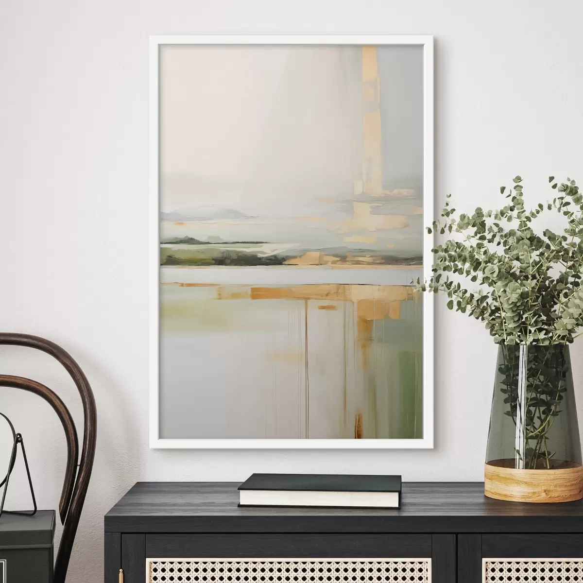 Poster Abstraktne maastik kollaste aktsentidega, minimalistlik kompositsioon maast, veest ja taevast, vaoshoitud värvidega Nr f46268
