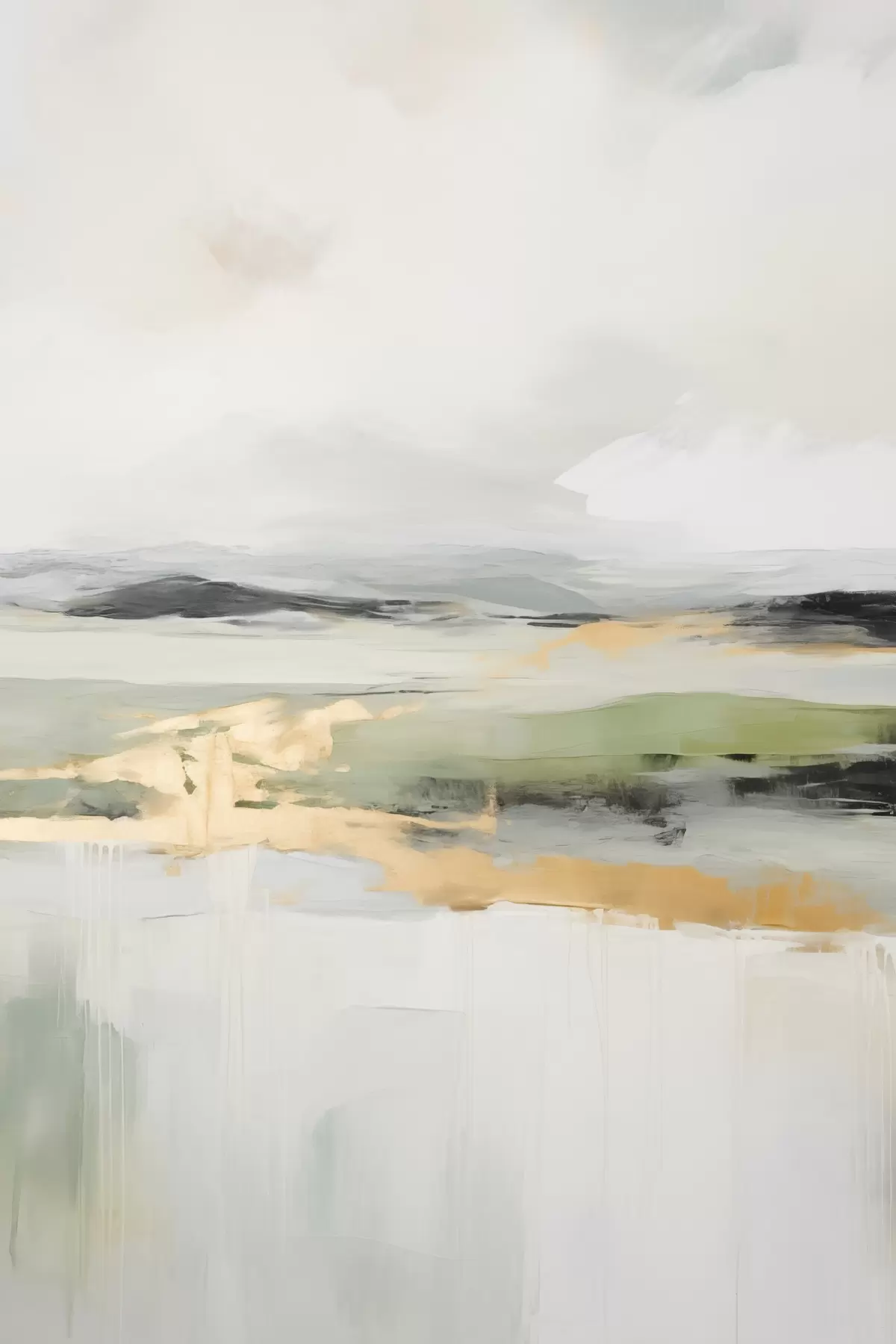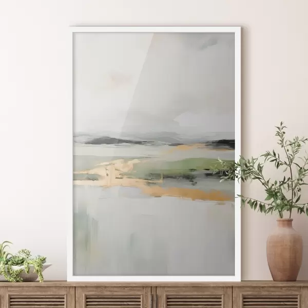 Poster Abstraktne maastik kollaste aktsentidega, minimalistlik kompositsioon maast, veest ja taevast, vaoshoitud värvidega Nr f46269