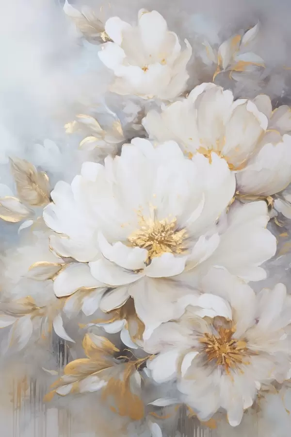Plakat Valged pioonid sinise südamikuga ja lehtedega, pehmed pintslitõmbed, helesinine taust, lillekompositsioon f46271