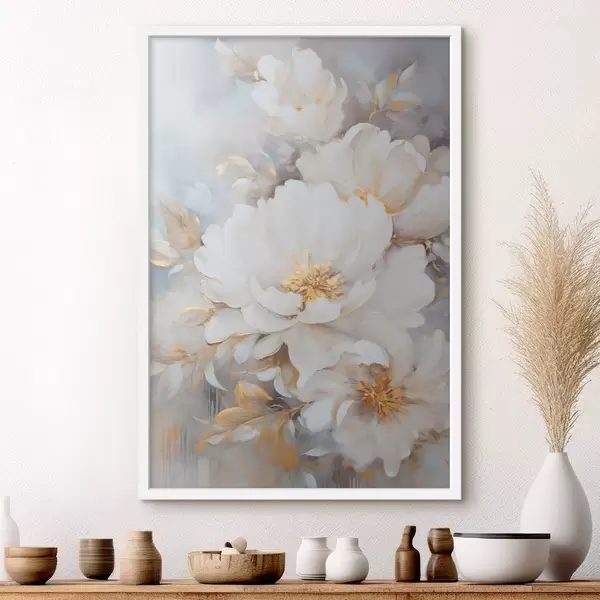 Poster Valged pioonid sinise südamikuga ja lehtedega, pehmed pintslitõmbed, helesinine taust, lillekompositsioon Nr f46271