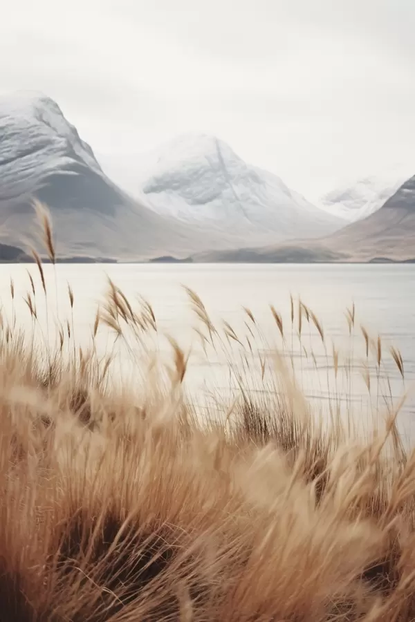 Plakat Pampasrohu väljak järve maastiku ees, taustal lumised mäed, pehme valgus f46282