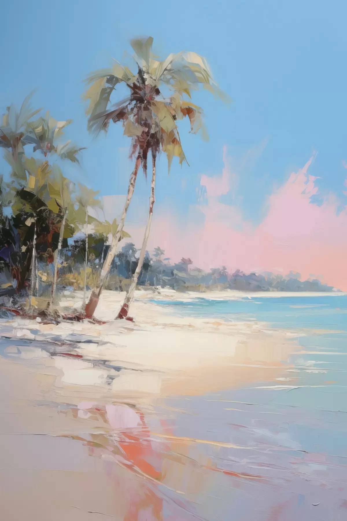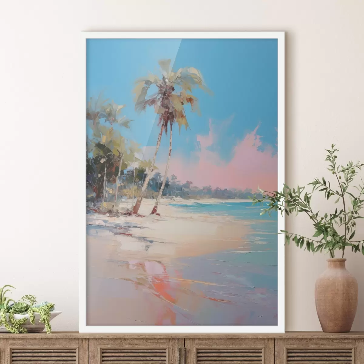 Poster Abstraktne troopiline rand valge liiva ja palmipuudega, sinine taevas valge pilvedega Nr f46285