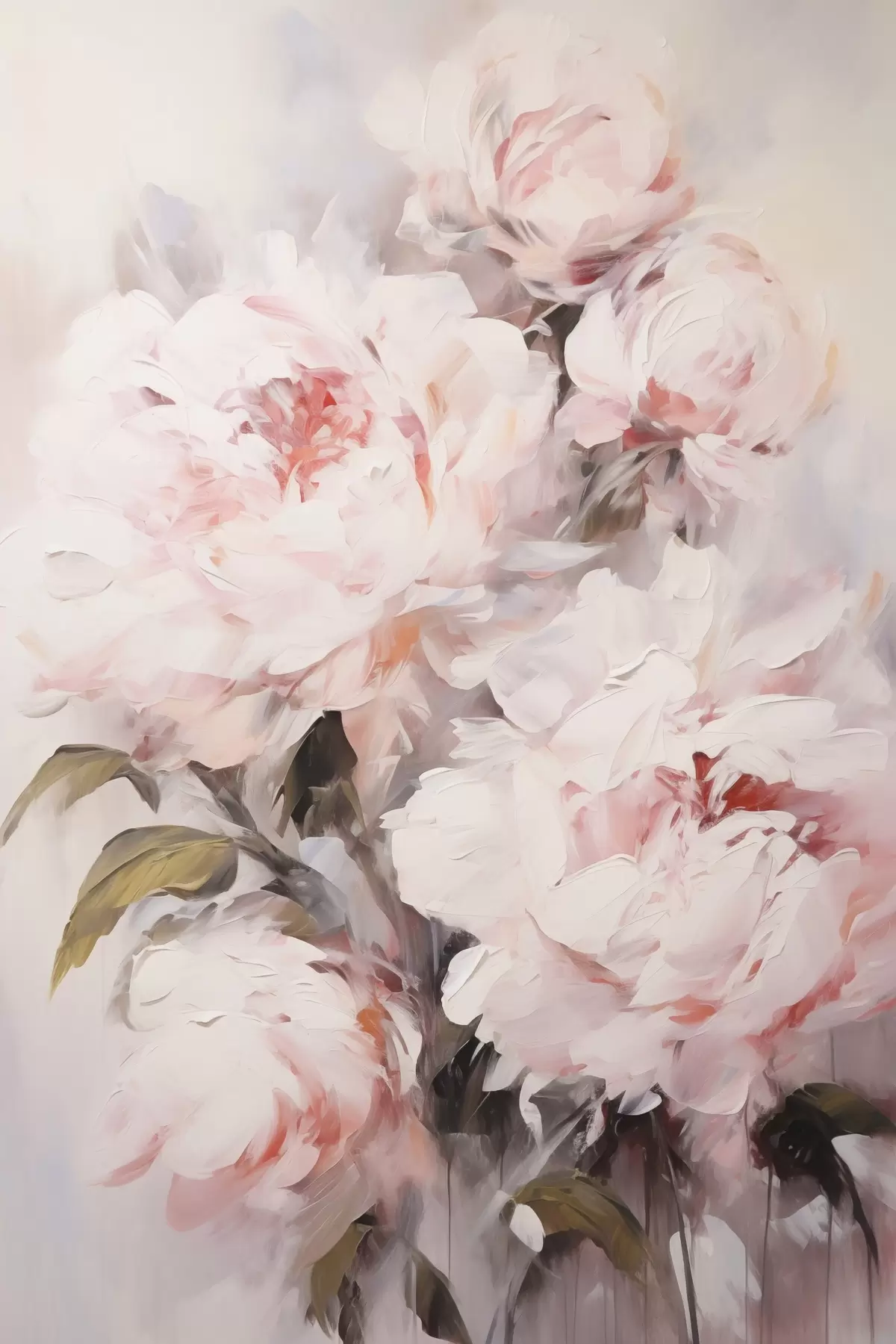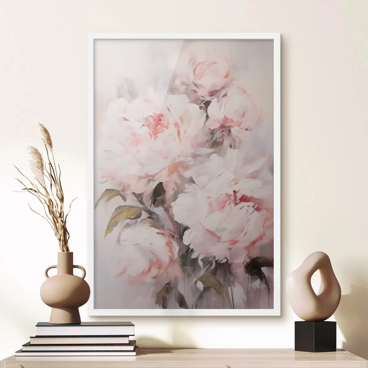 Poster Hele roosa peonite kimp roheliste lehtedega, pehmed pintslitõmbed, pastellvärvid, hele taust Nr f46294