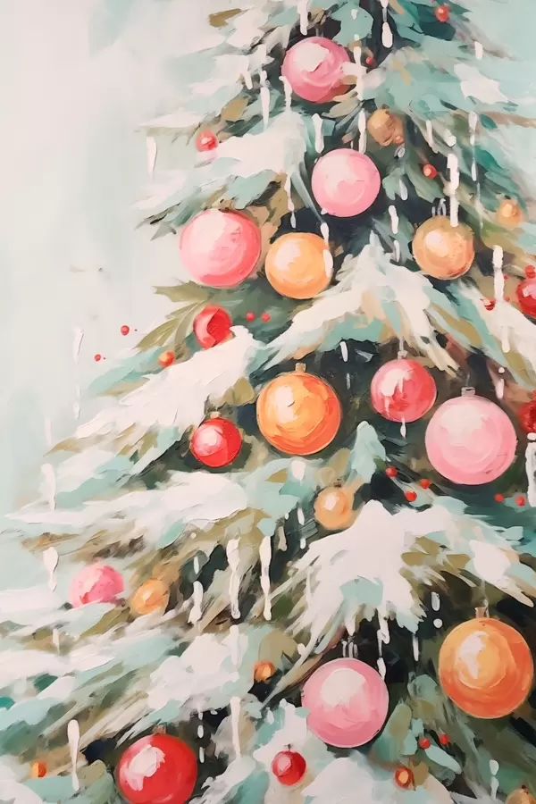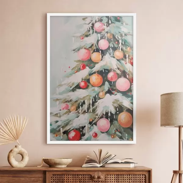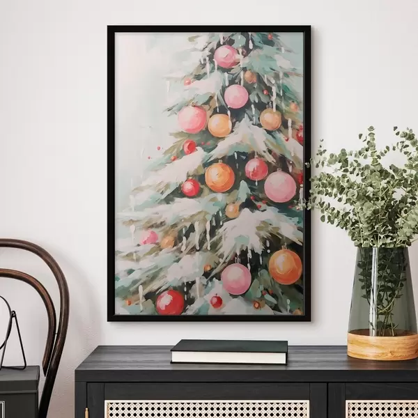 Plakat Jõulupuu lumega ja roosade pallidega f46480