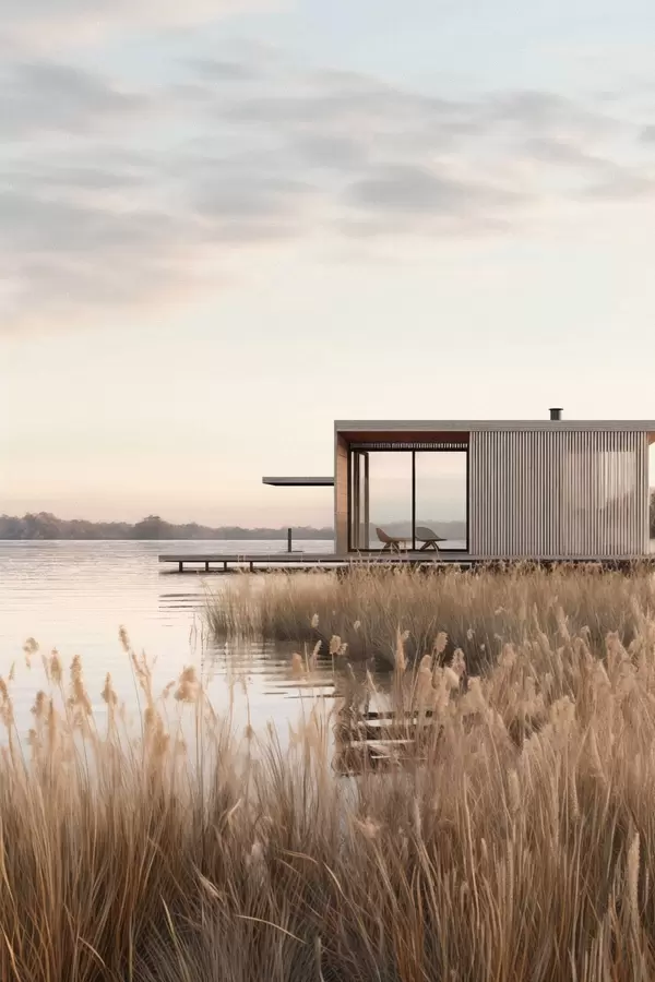 Plakat Kaasaegne järveäärne majake pilliroo keskel pehmes hämaras f46513