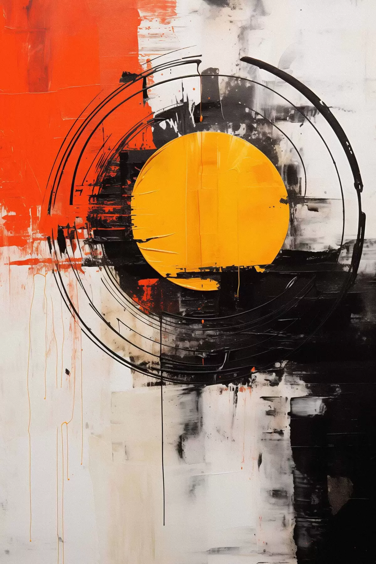 Plakat Oranž ketas musta ringi sees, jooned ja pritsmed f46550