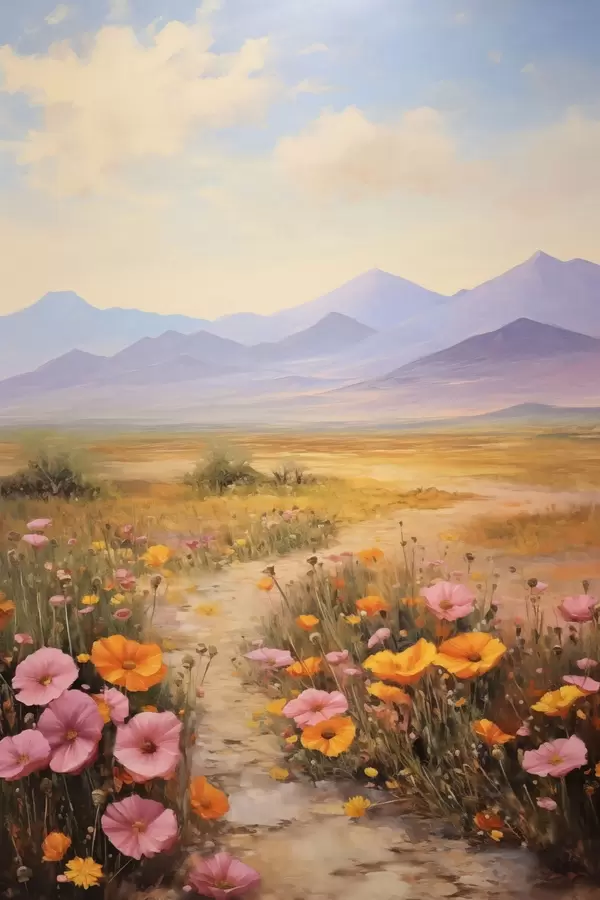 Poster Maastik, värviliste lillede väli mägedega taustal, pehmed ja pastelsed värvid Nr f46686