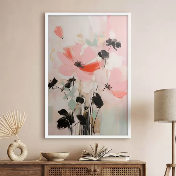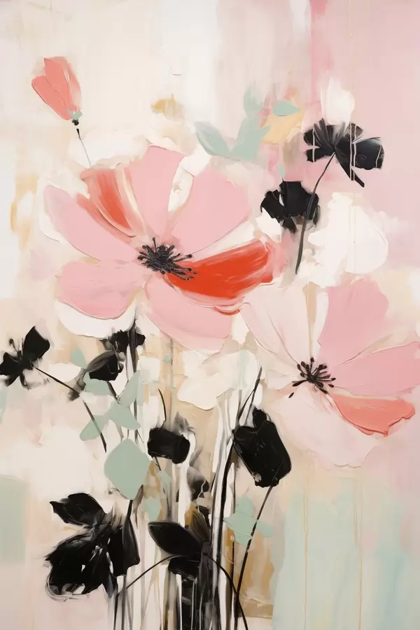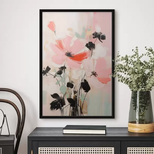 Poster Roosad ja mustad lilled lehtedega, pehmed pastelltoonid, abstraktne lillekompositsioon, minimalistlik kunst Nr f46687