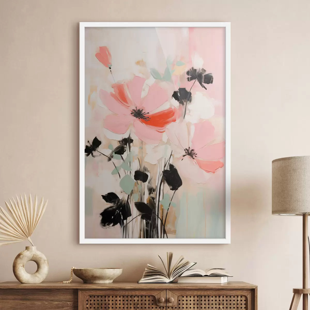 Plakat Roosad ja mustad lilled lehtedega, pehmed pastelltoonid, abstraktne lillekompositsioon, minimalistlik kunst f46687