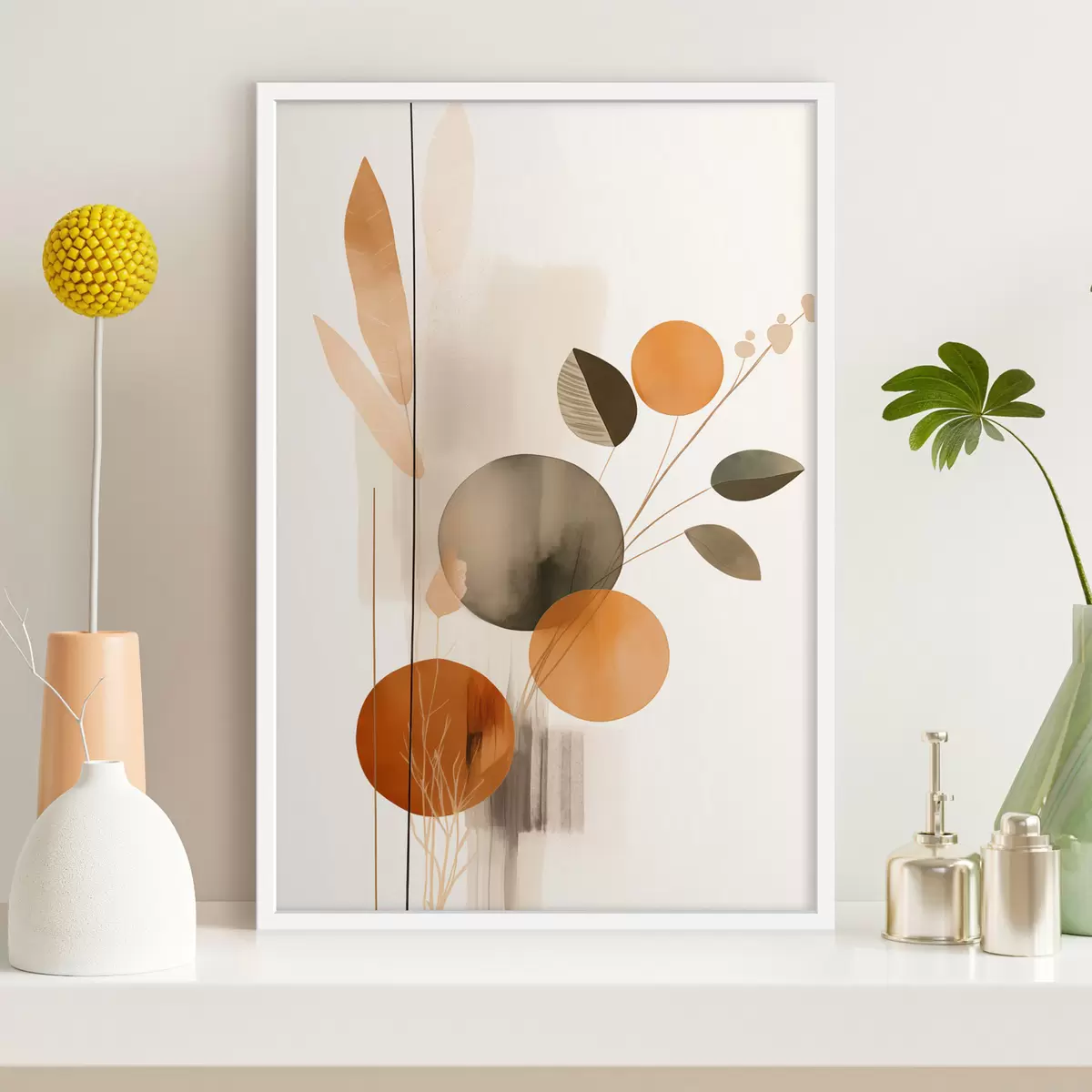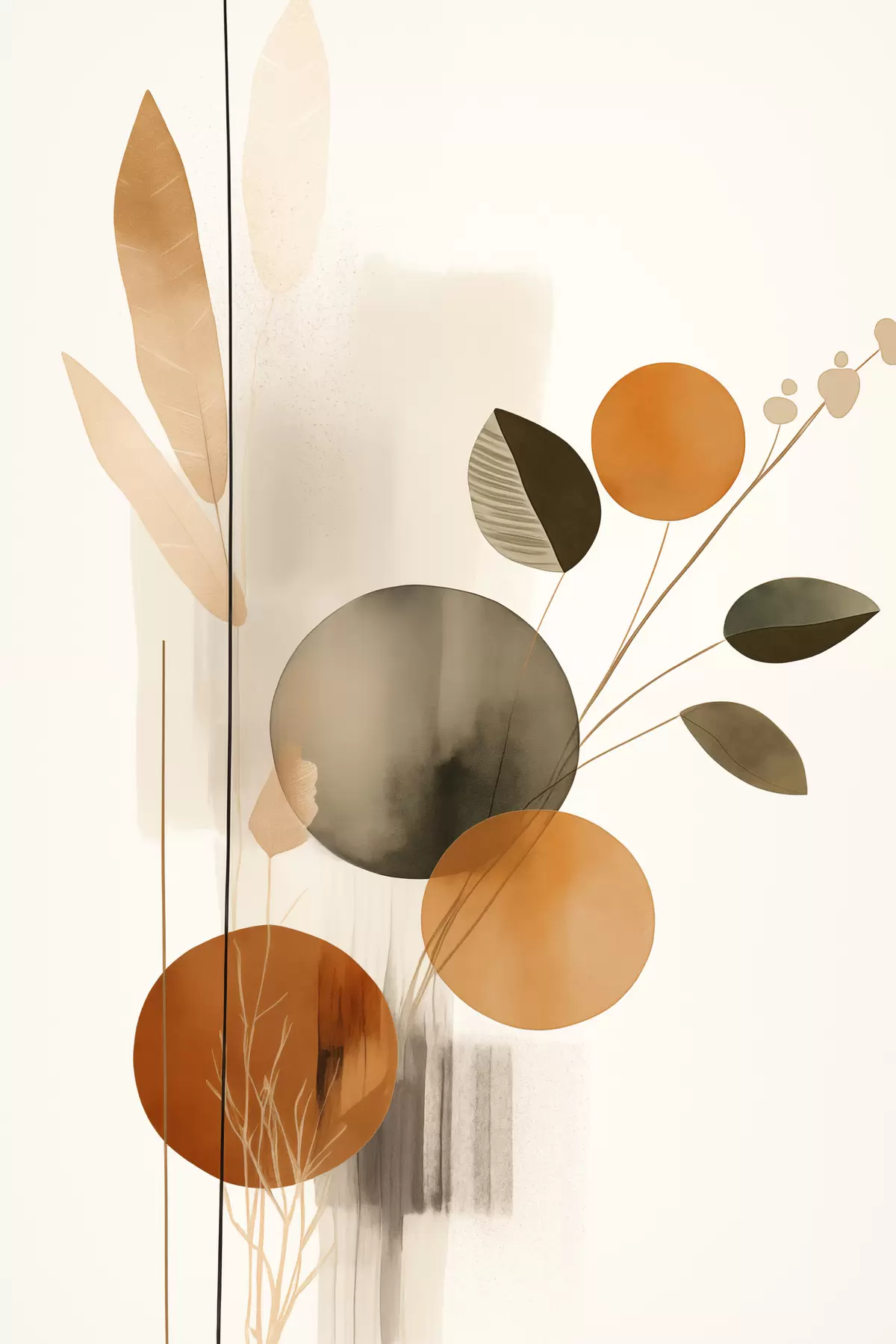 Poster Abstraktne maal, millel on oranžid ja hallid ringid, lehed ja oksad, modernne stiil, akvarelliefekt Nr f46697