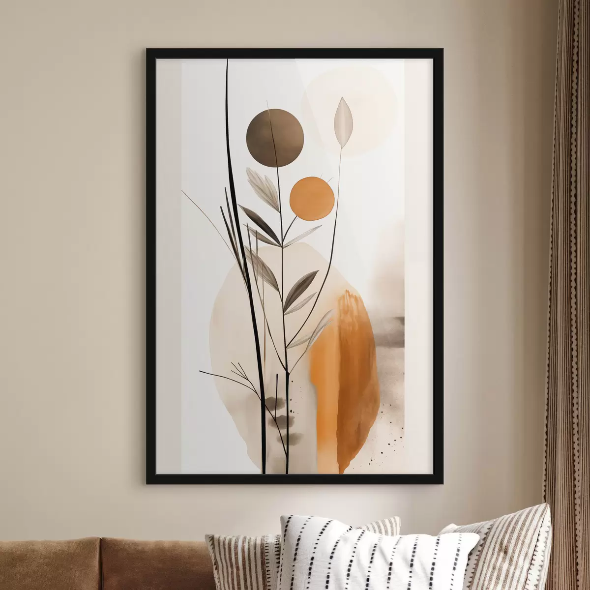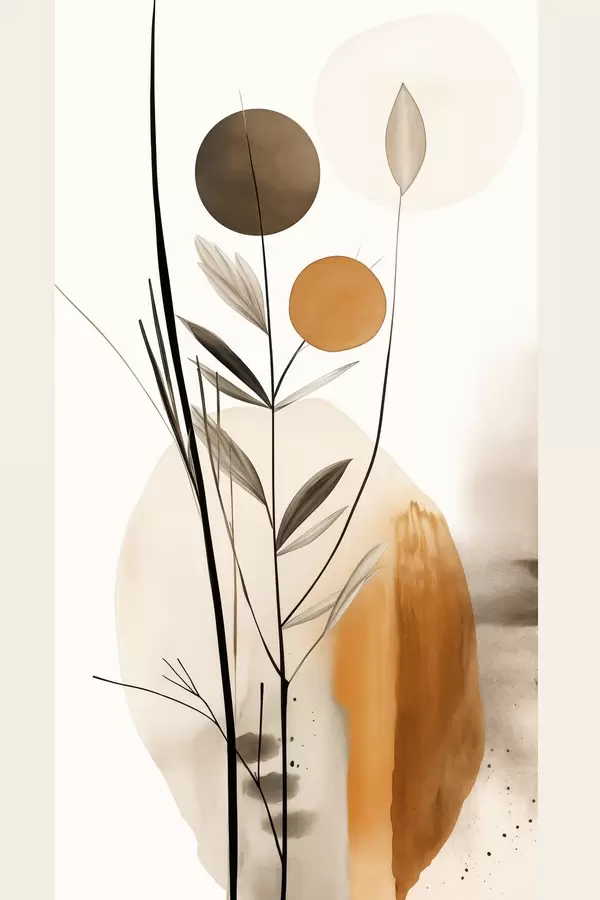 Poster Abstraktne maal, millel on oranžid ja hallid ringid, lehed ja oksad, modernne stiil, akvarelliefekt Nr f46698