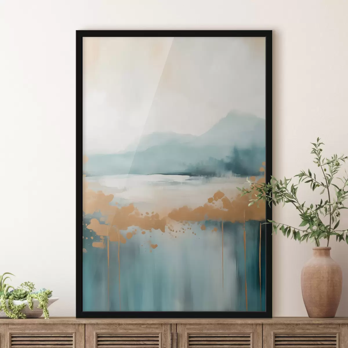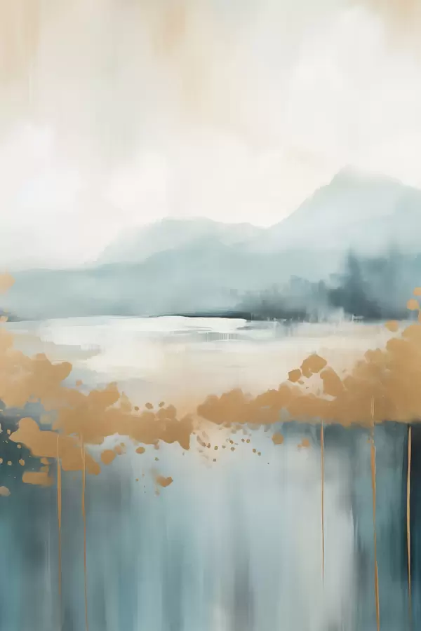Poster Abstraktne maastik mägedega ja järvega sinakasrohelises ja tekstuurse kollases toonis, pehmed pintslitõmbed, minimalistlik kunstiteos Nr f46703