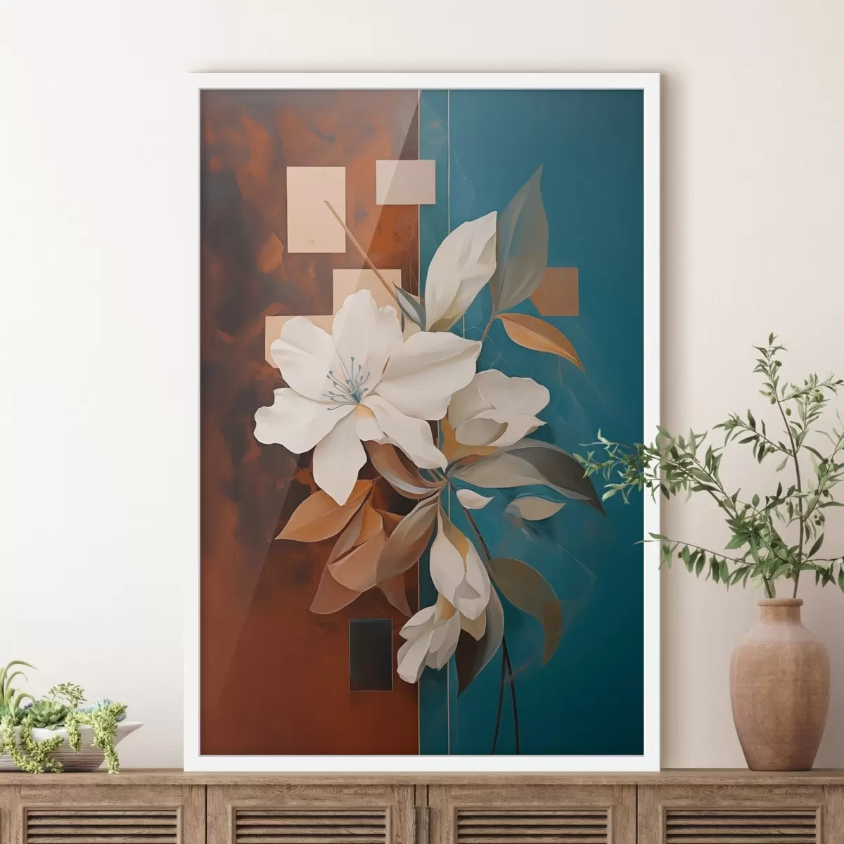 Plakat Abstraktsed valged lilled ja lehed pruuni ja sinise taustaga, minimalistlikus stiilis abstraktsete kujunditega. f46709