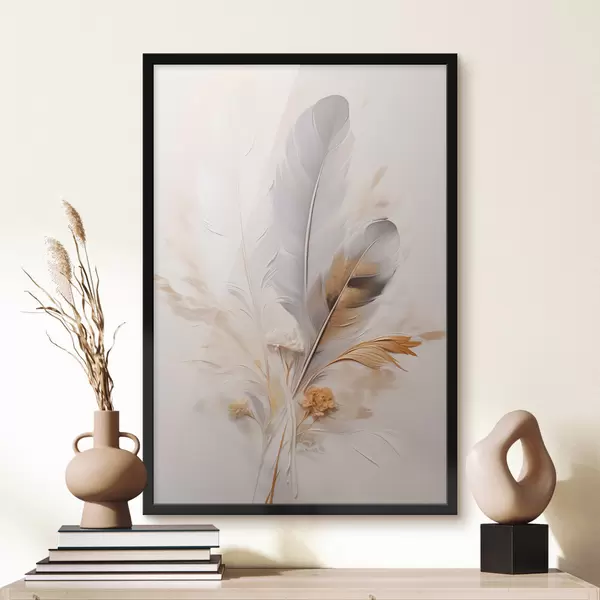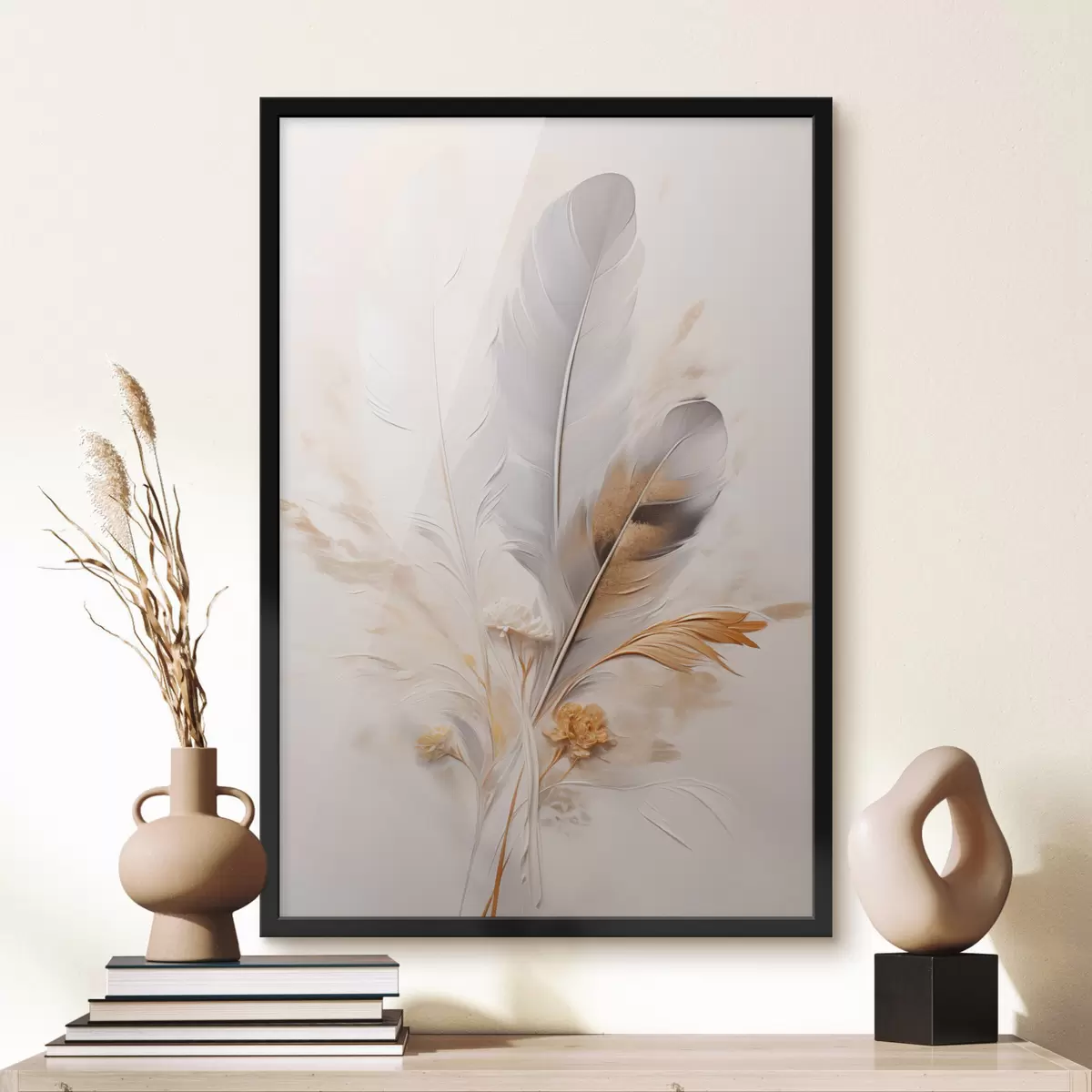 Plakat Abstraktsed suled, ümbritsetud beežide ja pruunide sulgedega, pehmed ja õrnad, helebeežil taustal f46712
