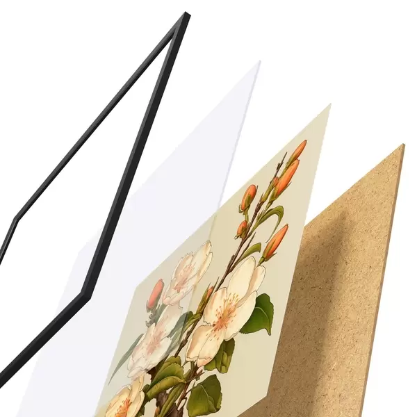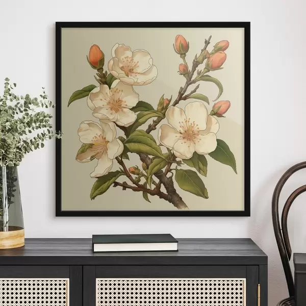 Poster Õitsev oks valgetega lilledega beežil taustal klassikalise illustratsiooni stiilis Nr f46923