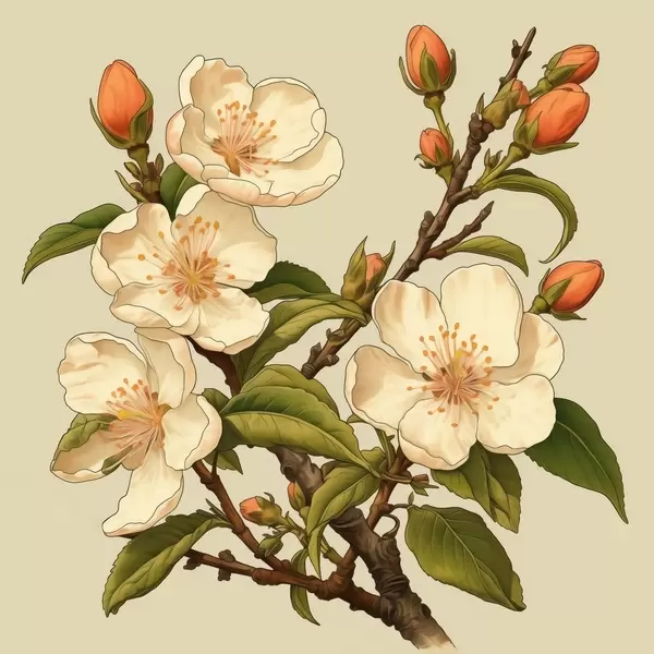 Poster Õitsev oks valgetega lilledega beežil taustal klassikalise illustratsiooni stiilis Nr f46923