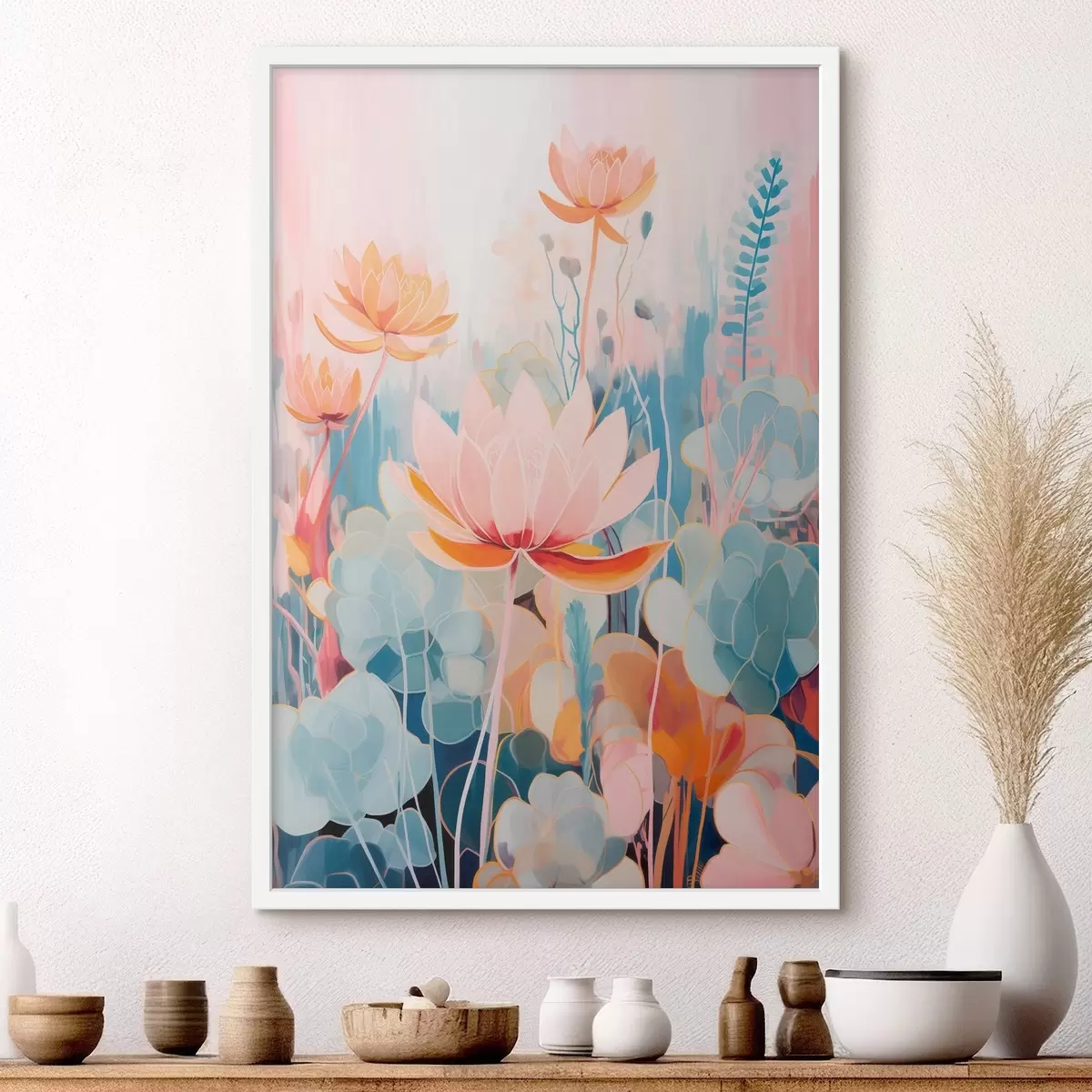 Poster Lootoslilled ja dekoratiivsed lehed roosa-sinises värvipalettis Nr f46929