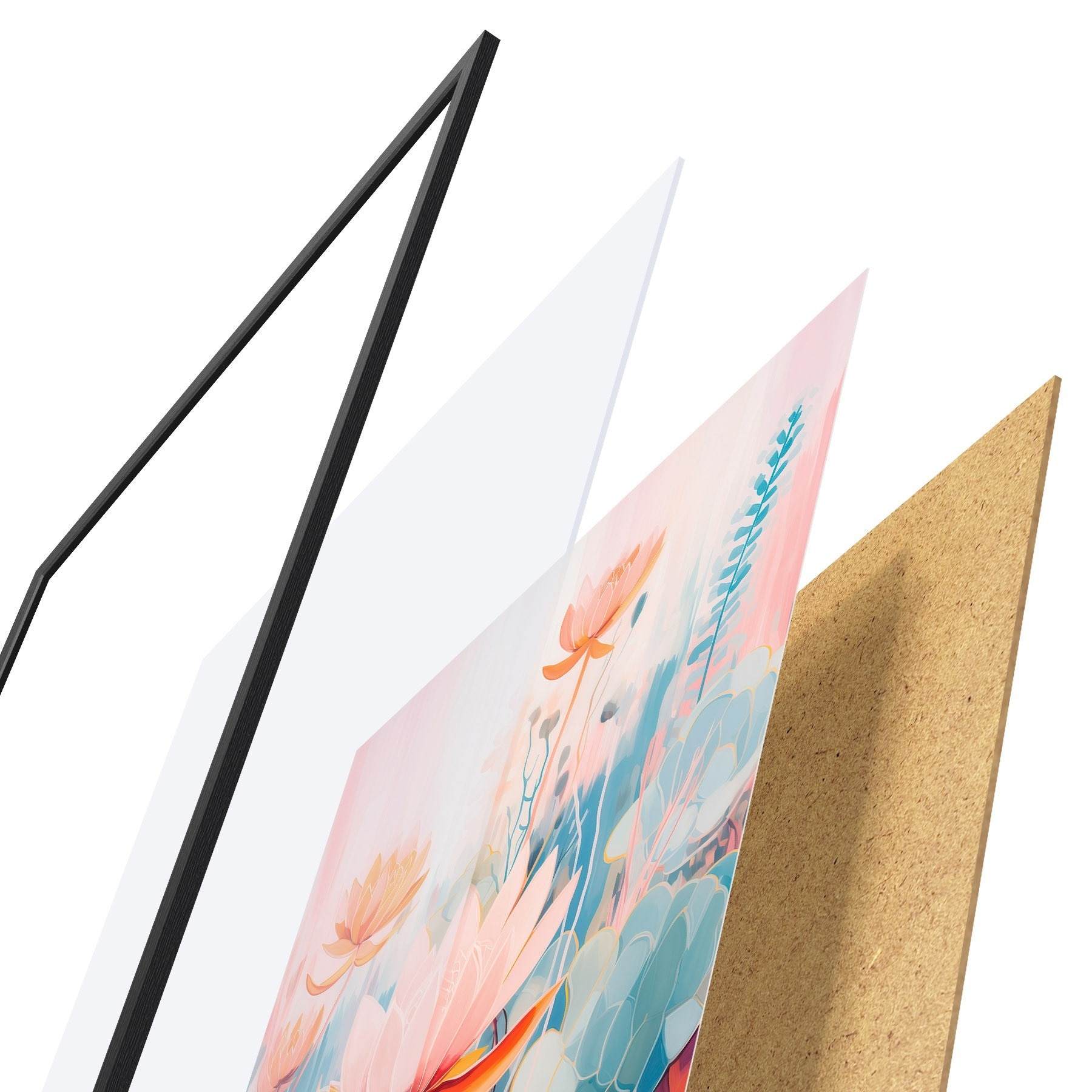 Plakat Lootoslilled ja dekoratiivsed lehed roosa-sinises värvipalettis f46929