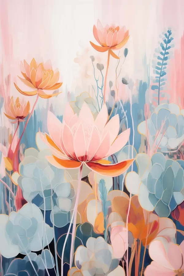 Plakat Lootoslilled ja dekoratiivsed lehed roosa-sinises värvipalettis f46929