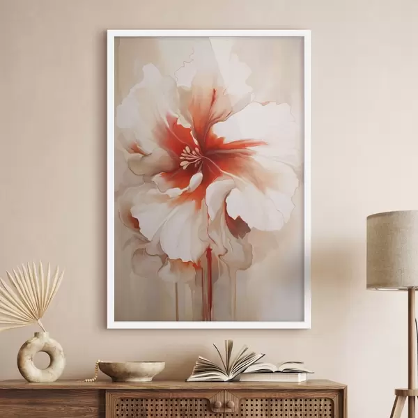 Poster Lähivõte valgest ja punasest õiest, millel on poolläbipaistvad kroonlehed ja voolavad värvitilgad. Nr f46941